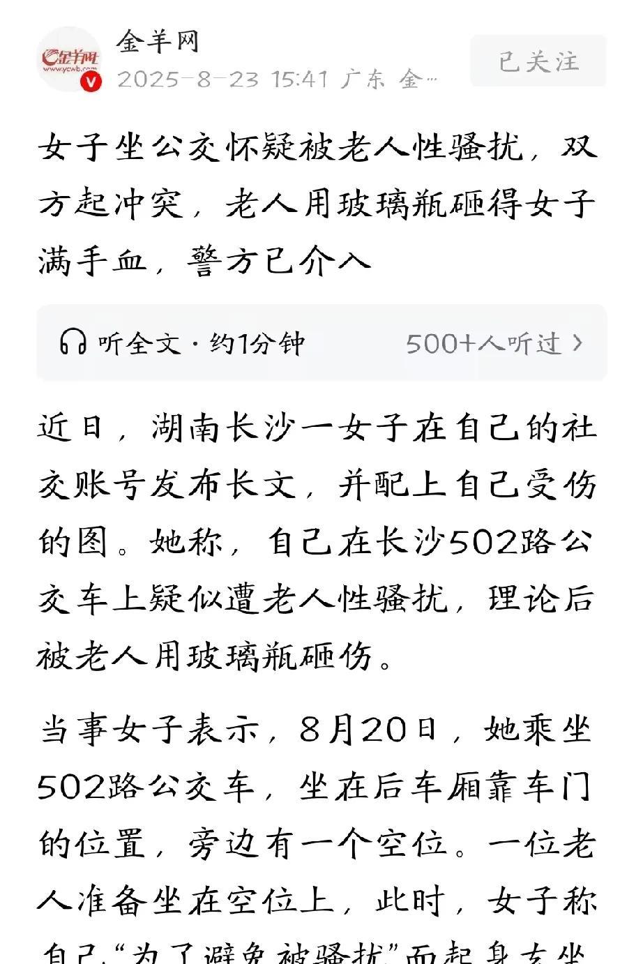 据金羊网8月23日报道,8月20号那天,周女士像往常一样,乘坐502路公交车出门。 上车后,她特意挑了后车厢靠车门的位置坐下,旁边正好有个空位。 随后,上来一位头发花白的老人,老人慢慢往后车厢挪,看到周女士旁边的空位,便准备坐下。 周女士见老人过来,心里“咯噔”一下,一阵不舒服。原来,她之前坐公交时,遭遇过被骚 扰的事儿。 打那以后,只要坐公交,身边有异性靠近,她就忍不住紧张,生怕类似的事儿再发生。 于是,她赶紧站起身,打算坐到前面去,离老人远点。 可就在她起身离开座位时,突然感觉手背被老人碰了一下,但她没有声张,心想可能是对方不小心,没必要小题大做。 但由于当时她心情不好,又想到以前吃过的哑巴亏,心里越想越气,这次不打算再忍气吞声,就坐到老人旁边和他理论。 周女士质问老人,为什么要碰她?老人突然被这么一问,整个人都懵了,一脸不可置信。 老人气得浑身发抖,对周女士破口大骂,说她长得丑,丑人多作怪。 两人你一言我一语,吵得不可开交,老人被气得失去了理智,拎起一个玻璃瓶子,朝着周女士狠狠砸了过去。 周女士没反应过来,被砸到了手,鲜血直流,到医院做了手术。 8月22号,据公交集团的工作人员反映,他们查了车上的监控,没发现老人有明显的不当接触,但确实是老人先动的手,砸伤了周女士。 从法律角度,应该如何看待此事? 《民法典》第1010条规定:违背他人意愿,以言语、文字、图像、肢体行为等方式对他人实施性 骚扰的,受害人有权依法请求行为人承担民事责任。 性 骚扰的认定需要综合多方面因素,如接触是否违背他人意愿、是否存在性 暗示等,若仅有短暂的肢体触碰,没有其他相关证据佐证,一般很难认定。 目前,公交集团查看监控后未发现明显的不当接触,仅女子感觉手背被触碰这一情况,难以认定老人的行为构成性 骚扰。 而老人动手伤人,要承担相应的法律后果。 但因其已满七十周岁,不执行行政拘留处罚,同时,要承担民事赔偿责任,需赔偿女子因受伤产生的医疗费、误工费、护理费等。 目前,警方已经介入处理此事。
