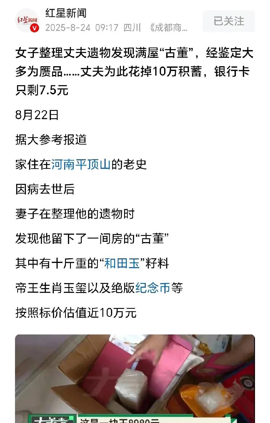 河南平顶山,女子整理丈夫的遗物,发现他生前攒了一屋子古董,平时省吃俭用,生病住院