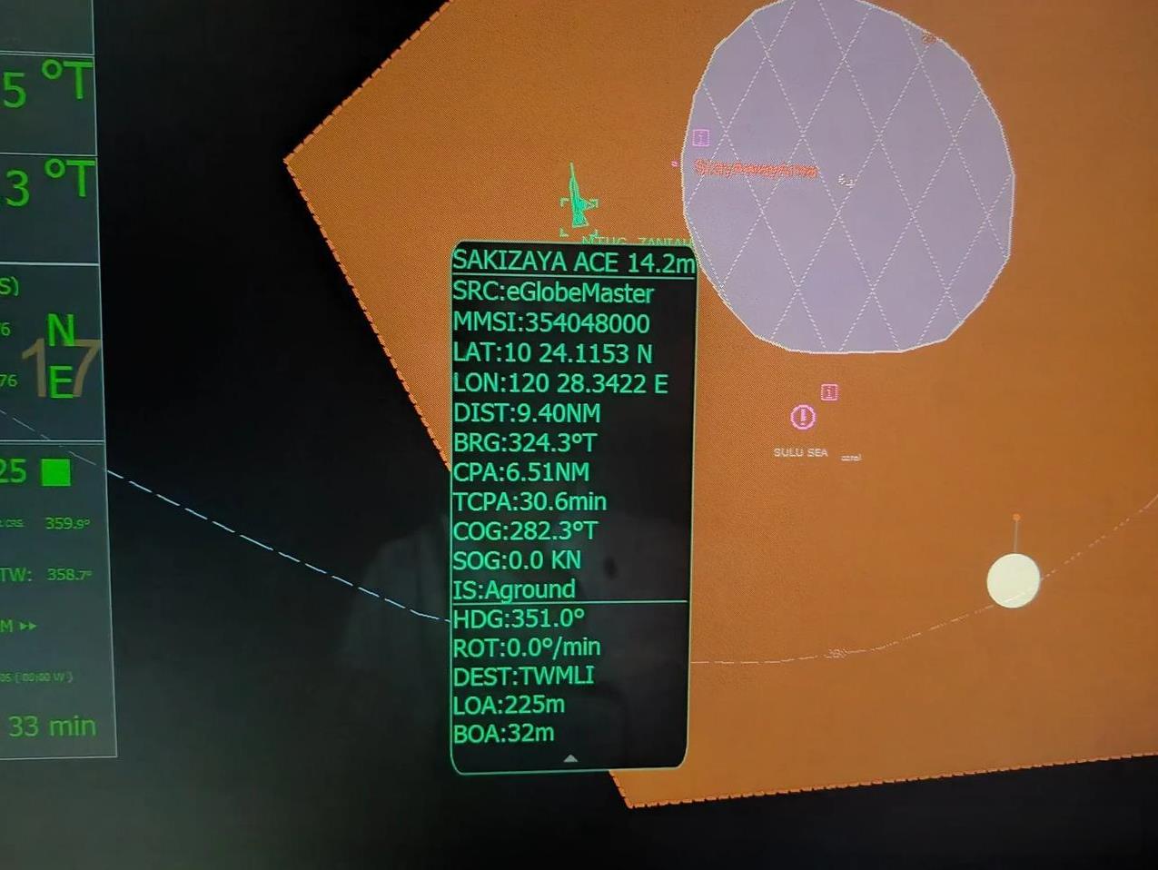 我们船舶现在已经航行到了苏禄海了。在我们船的左前方,有一条船也是从黑德兰开航,去台湾卸货的,从电子海图上可以看出,这条船长225米,宽32米,当航行至图一黄色区域时,由于驾驶员的原因,搁浅了,这么辽阔的苏禄海,就这么一个地方,驾驶员居然能把船开到这个地方,真是无语了,这个地方最浅处海水仅6.4米,从船舶资料上可以看出,这条船的吃水是14.2米,航行至这个地方不搁浅才怪呢! 现在他们船的旁边,有一条拖轮,听说是在现场观察,以免出现不测,及时救援。