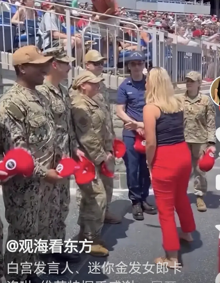 美国人太不讲究形式了。 近日,美国白宫女发言人卡洛琳维莱特近期在一处运动场所对前来维护治安的美国国民警卫队成员表示感谢,并同他们每个人握手。 从照片中可以看到这位美国金发大美女发言人。 卡洛琳维莱特竟然穿着拖鞋出现在这么隆重的场所。 上身只穿了个背心 这种穿着也实在太随便了,让人感到很震惊。 美国人往往就是这样。 有时候他们在上班场合,甚至还允许带着孩子来。 这样更加人性化和接地气