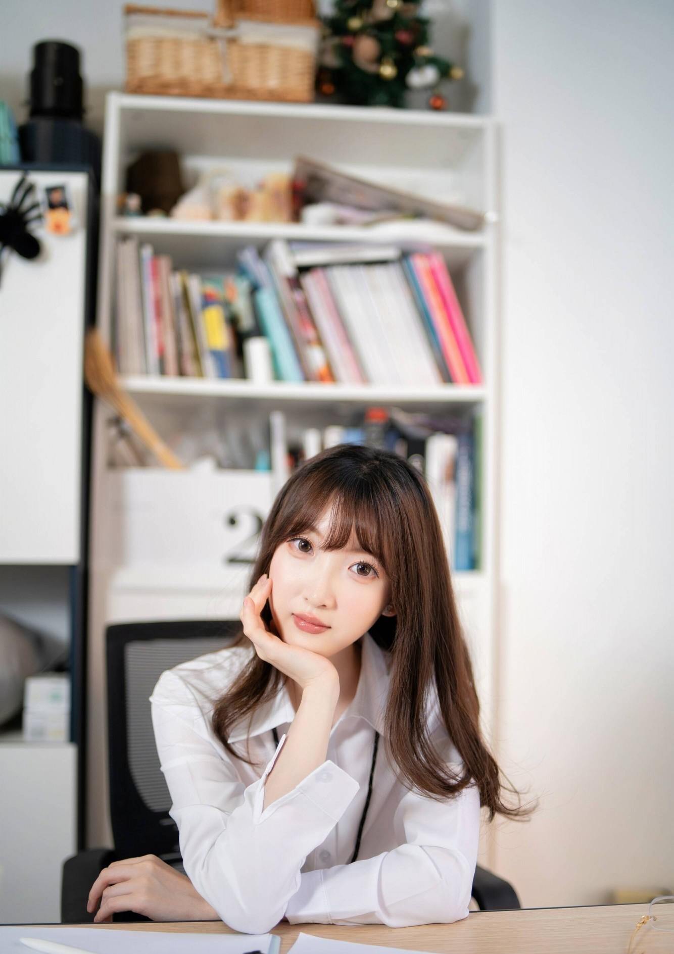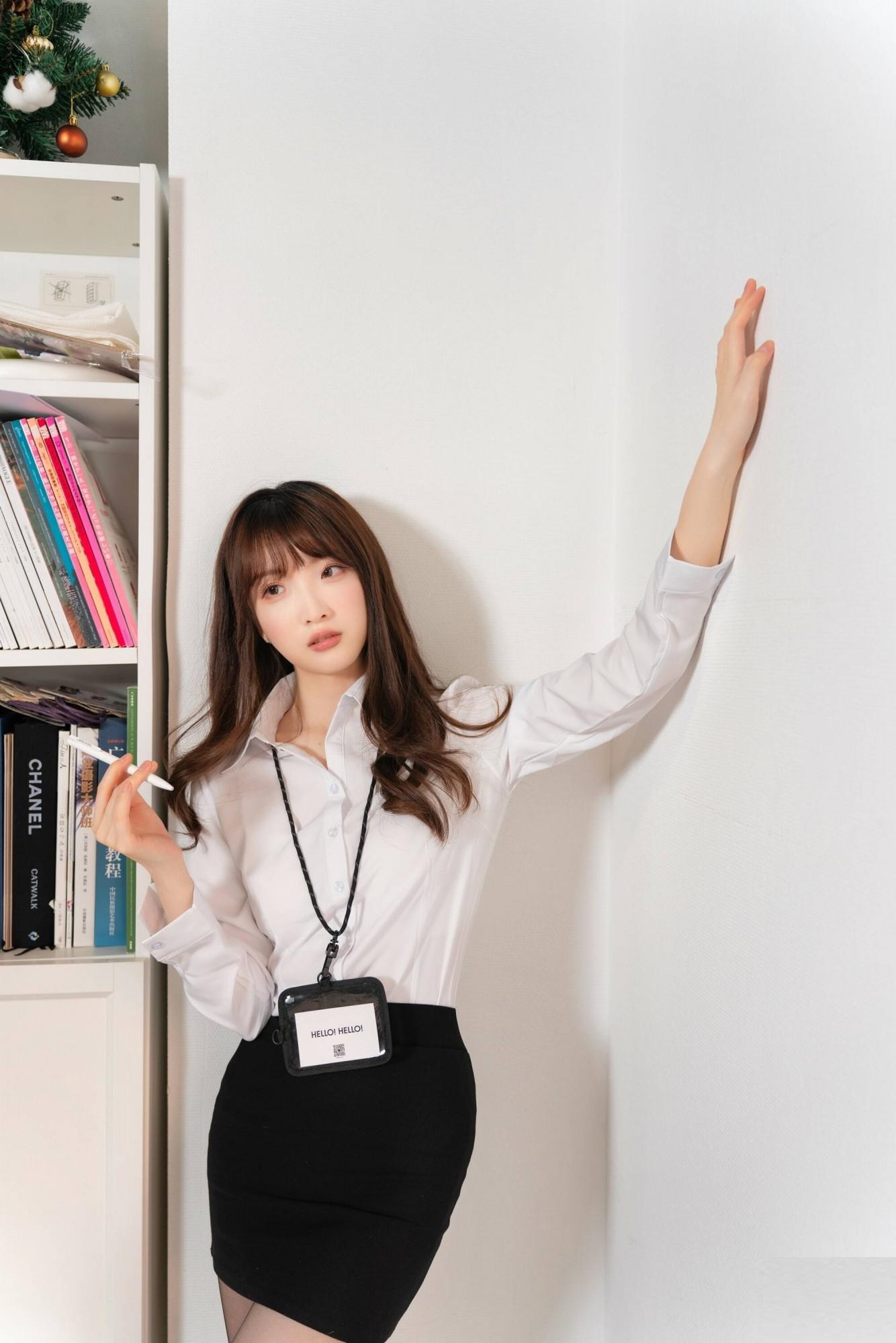 她站在书架旁,或坐在办公椅上,每一个姿势都散发着迷人的气息。手中的笔、玩偶,都成了她展现职场魅力的道具。💕