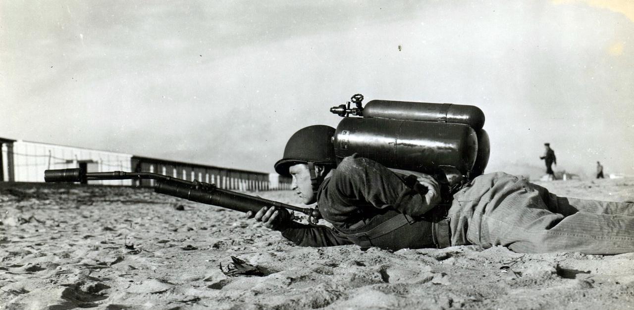 “国军”装备的是什么东西?1945年10月,上海光复后,“国军”陆续进驻上海。照片中的“国军”士兵都身穿新做的军服,衣着笔挺,还戴着白手套,看上去挺精神的。其中,画面右侧的两名士兵肩扛美制“巴祖卡”火箭筒,还扛着一支汤普森冲锋枪(看起来像是M1A1型,就是《拯救大兵瑞恩》中汤姆·汉克斯用的那一款,参见图2)。 不过,画面左侧那几名士兵肩上的武器看不出来是什么?不像是日式掷弹筒,也不像是枪榴弹发射器,看来看去不知道是什么“新式武器”。后来觉得,可能是美制M1式喷火器的喷射筒(参见图3),但士兵们并没有随身背负油罐(大概是太沉了,不想在入城式上背着走路)。 美制M1式喷火器的性能比较一般,射程只有10~20码,在太平洋战场上很快就淘汰了。