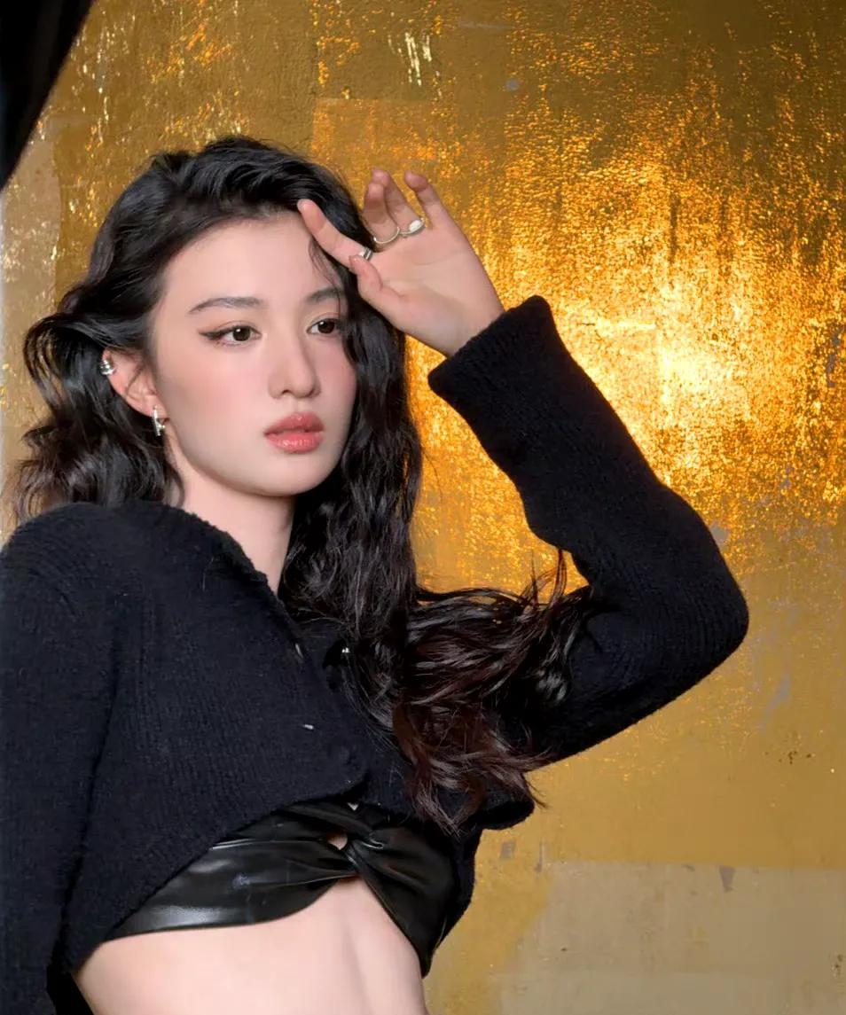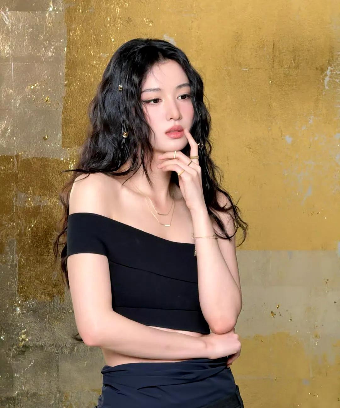 黑金底色晕染慵懒氛围,卷发漫过肩头,金饰点亮暗调。从抹胸裙的优雅到露肩装的随性,再到短针织的飒爽,每一次定格都在诠释——黑色不止一种姿态,而她是最鲜活的注脚。