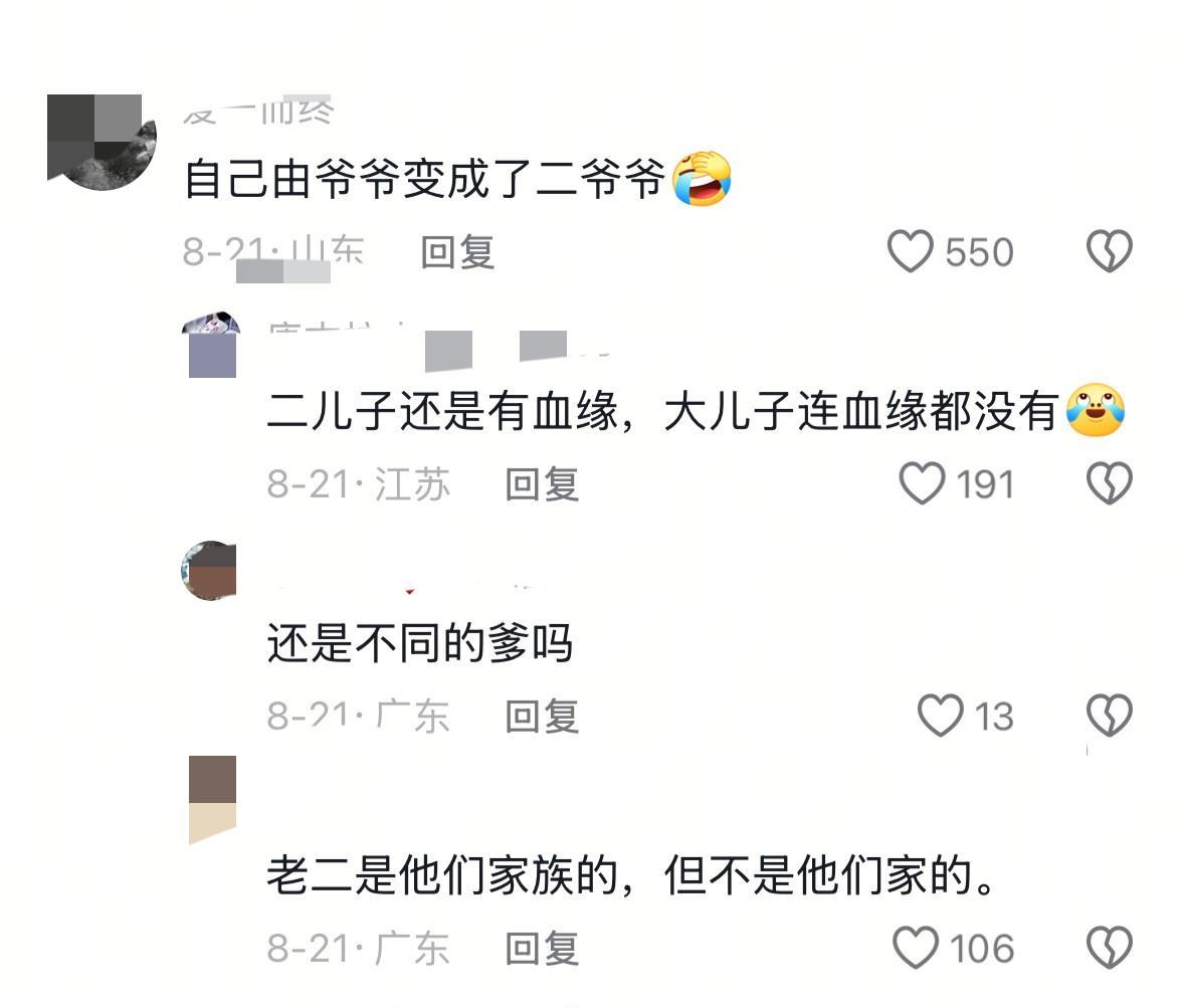 现在日子最难熬的是姜洪涛的父母,[泣不成声]两位七十多岁的老人吃不下睡不着,真是有苦难言! 他们在孙子身上倾注了全部心血,好不容易带大,结果一个亲的都没有。 大孙子从生下来就是两个老人带的,一直贴心陪伴到他读大学。可现在他翻脸不认人,不仅动手打了姜洪涛这个明面上的爸爸,对爷爷奶奶也断绝了关系。 小孙子就更可气了,本身是自家孙子,现在却变成了他大哥家的亲孙子。由爷爷变成了二爷爷,因为那孩子是老人的亲侄子姜洪海生的。 两位老人直言,老两口七十多岁了,现在连个后都没有,想想这个残忍的现实都不能接受! 最关键的一点是,他们还无处说理。 因为现在姜洪海也不露面了,平日里压根见不着他人。而姜洪海的父亲作为老人的亲大哥早已瘫痪在床,并且已经痴呆了,跟他说啥也听不懂。 所以,两位老人所有的压力都承担在自己身上,连个宣泄口都没有。这么多年里,村里人全都知道这个情况,但由于他们一家人都老实善良,从未与他人发生过争执,所以,全村没有一个人说过这个事,连暗示都没有给过他们。 实话说,看到老人的访谈视频真不是滋味。辛辛苦苦带大的孙子,没有一个是他家的,小孙子是亲侄子姜洪海的残忍现实,更是严重伤害到了两位老人。 老人最后感慨的说了一段话:过去没出五福都是一家人,是很亲的,怎么现在当代就不亲了呢?