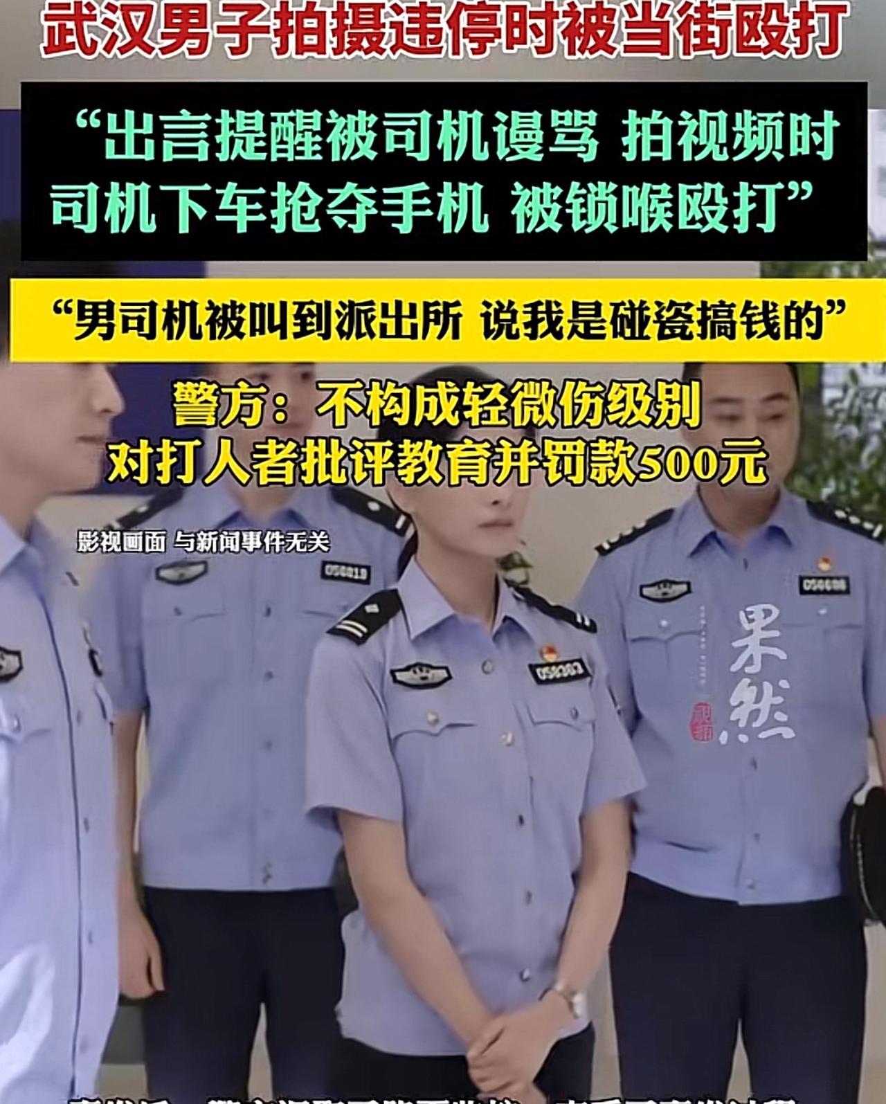 武汉,男子外出,见一辆岚图商务违停,后面车辆只能避让、绕行,甚至有人按喇叭。车里的司机却跟没事人似的,和副驾上的一名女子有说有笑的聊天。男子看不下眼去了,上前提醒却被拒,随后,他拿出手机拍摄司机车牌,占道位置,准备向相关部门举报。司机见状,对男子骂骂咧咧:再拍就搞你!接着司机就下车抢夺男子手机,并将男子推倒在地,锁住男子喉咙。岂料,车上又冲出两人,同时对他拳打脚踢,男子见对方人多势众,一直未还手。事后,男子报了警。没想到,对方反咬一口,说他是碰瓷搞钱的!警方的处理结果让男子意难平。 据澎湃新闻8月25日报道:李飞本以为警方会替自己主持公道,可警方的处理结果让他难以接受。 李飞将自己满肚子委屈,向记者一吐为快。 8月1日中午,李飞从某医院后湖院区路过的时候,见在医院对面的红绿灯那儿,一辆岚图商务车大大咧咧地占据着右拐车道,就这么违停在那儿,后方的车辆都被堵得死死的,动都动不了。 这个位置可特殊了,旁边是医院,还连接着高架桥入口,私家车、电动车来来往往的特别多。 因为这辆商务车占道,后边的车没办法,只能压实线绕行,特别危险。 周围的车都在疯狂按喇叭,电动车也得左躲右闪地避让 ,可车上的司机和副驾的女子却跟没事儿人一样,还在那儿有说有笑的。 李飞平日就是个路见不平一声吼的人,看到这一幕,无法做到视而不见。 于是就上前,好心出言提醒,说他们挡住后边车了,结果呢,换来的不是一句感谢,而是司机劈头盖脸的一顿骂。 李飞心里那叫一个气啊,想着不能就这么算了,于是走到车头位置,拿出手机准备拍摄车牌和道路位置,想着把这违章行为向相关部门进行举报。 没想到司机是个不怕事的,用手指着他的鼻子,威胁道:信不信,你再拍就搞你人! 副驾上的女子倒有几分明事理,她赶紧向李飞解释:我们只停了一分钟! 司机见李飞还在拍,怒气冲冲的下了车,疯狂抢夺他的手机,过程中,李飞被对方锁喉,肚子还被顶了一膝盖,因为力量上的的悬殊,最后直接被撂倒在地上。 他余光还看到车里又下来两个人,朝着他冲过来,对着他的头部、腹部一顿击打。 李飞见对方人多势众,根本不是对手,干脆也不还手,只是伸手抓住了其中一人的胳膊,可最后还是松开了。 李飞手里的手机成功被对方抢走,对方想把手机直接摔毁,李飞赶紧说手机价值超过5000元,对方这才作罢。 事情发生后,李飞马上报了警,警方马上展开了调查,将司机传到警局。 没想到,到了派出所做笔录的时候,司机居然反咬一口,说李飞是故意碰瓷想搞钱的! 这颠倒黑白的说法让他见识了,他相信警方会给自己一个公道。 随后,他赶紧去附近医院做了身体检查,结果显示,他不仅有心律不齐,颈部还出现了明显瘀肿,身上更是有多处抓伤。 可意外的是,警方出具的《鉴定意见通知书》显示,最终鉴定结论是李飞的伤情不构成轻微伤级别。 李飞按照交警部门的要求上传举报证据,结果发现相关部门的违章停车的举报类别里,只有小区内道路和消防通道两个选项,根本不接受道路违停举报项这可把李飞郁闷坏了,只能等警方的处理结果。 他在煎熬中等待了10多天,终于在8月15日等来了警方的处理结果:因为违章占道发生时车上有人,按照规定不作处罚,只是对司机进行了批评教育。 对于这个结果,李飞很是无语,心里像堵块大石头,可是让他憋屈的还在后头。 8月21日,警方出具了《行政处罚决定书》上面清楚的写着:因李飞所受损伤程度不构成轻微伤 ,决定对违法行为人处罚款500元。 这个处罚结果让李飞不能接受,他咽不下这口气,找来媒体曝光此事,让网友给评评理。 《道路交通安全法实施条例》第63条规定:机动车在道路上临时停车,应当遵守一系列规定,比如在设有禁停标志、标线的路段,在机动车道与非机动车道、人行道之间设有隔离设施的路段以及人行横道、施工地段,不得停车等 。 虽然交警部门以“违章占道时车上有人”为由未作处罚,仅对司机批评教育,是依据当地具体规定执行的结果,但各地对这类违章的处理尺度存在差异,比如深圳就曾大力鼓励市民“随手拍”举报违章,以此强化交通秩序管理。 《治安管理处罚法》第43条规定:殴打他人的,或者故意伤害他人身体的,处五日以上十日以下拘留,并处二百元以上五百元以下罚款;情节较轻的,处五日以下拘留或者五百元以下罚款 。 本案中,司机对李飞进行殴打,还有两人从车上下来一同参与,属于结伙殴打他人。 尽管最终鉴定李飞伤情不构成轻微伤,但这种结伙殴打他人的行为性质较为恶劣,按照法律规定,本可以给予更严厉的处罚,比如拘留等,仅罚款500元的处罚,确实难以服众。
