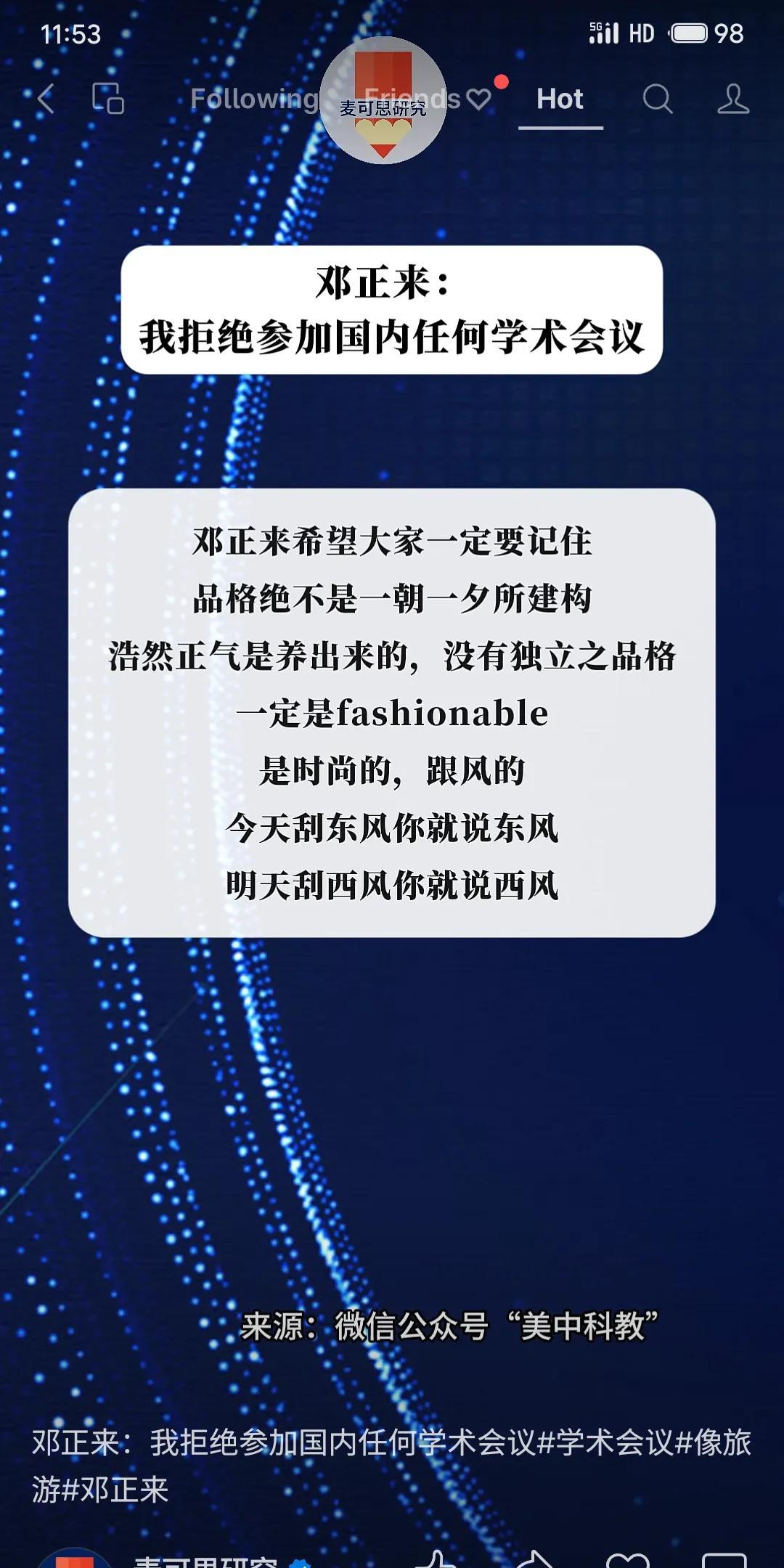 著名学者邓正来坚持三项原则:拒国外邀约、拒国内学术会议(斥为重复旅游)、拒杂志约稿。他强调独立品格非一朝一夕能成,反对跟风媚俗,只愿发表自己真正感兴趣的研究。
