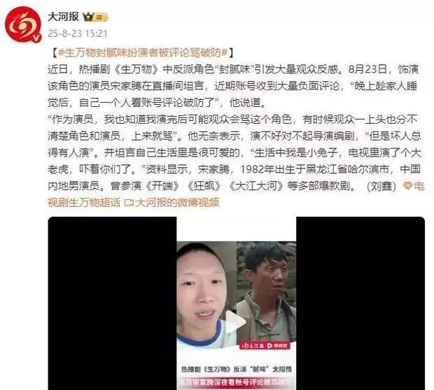 【“封腻味”被骂到失眠!宋家腾含泪回应:生活中我是小兔子,演坏人是职业需要】 演技太好也要挨骂?《生万物》反派演员宋家腾深夜破防了! 8月23日,在剧中饰演“封腻味”的宋家腾直播时坦言,最近被网友骂到睡不着觉。趁着家人入睡后,他偷偷翻看账号评论,结果直接被负面评价整破防了。这位42岁的哈尔滨演员无奈表示:“演不好对不起导演编剧,但坏人总得有人演啊!” 令人唏嘘的是,这位在《开端》里演过热心邻居、在《狂飙》里当过警队队员的黄金配角,如今却因为演绎反派太过逼真而遭殃。他委屈解释:“生活中我是小兔子,电视里演了个大老虎,吓着你们了。” 其实从《大江大河》到《生万物》,宋家腾每次现身都带着“剧抛脸”特质。观众越骂得狠,越证明其演技精湛。只能说:角色行为请勿上升演员!给实力派留点生存空间吧~