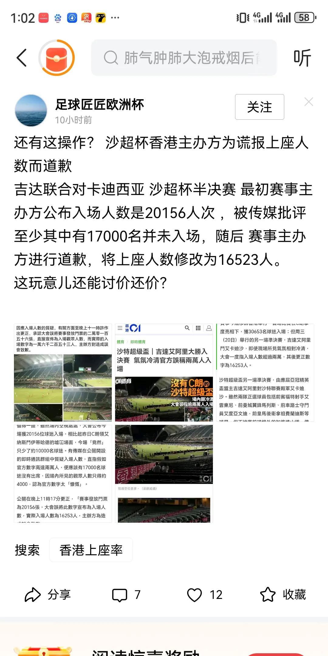 C罗的第一场比赛实际观众为三万零六百多点,但是主办方想尽一切办法遮掩,转播镜头一度被控制,造成观众席座无虚席的假象。 现在,第二场观众数据出来了,仅一万六千多,不足一半。主办方为什么要撒谎?其实也不尽然,真实情况是主办方方连售带送出去两万多张票,但送出去的三四干票人家来不来就不好说了。 最后真实情况是:史称足坛商业价值价格最高,粉丝超10亿的C罗,在其粉丝称为“第二故乡”的中国香港的沙特超级杯决赛中,观众到场一万六千多…