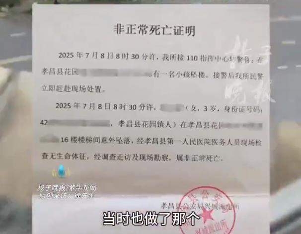 女童16楼坠亡父亲质疑小区防护,女童16楼坠亡父亲还原事发经过 近日,湖北孝昌县3岁女童小慧(化名)从小区16楼电梯走道意外坠亡。小慧父亲徐先生向记者回忆,7月8日上午8点半,小慧母亲下楼扔垃圾,将孩子独自留在家中,仅十分钟间隙,3岁的小慧竟独自打开进户门,跑到电梯走道寻找妈妈。“孩子从小只认我和她妈妈,离开视线就会到处找人,”徐先生说,小慧身高92厘米,可能因为够不到1.2米高的电梯按钮,便爬到了旁边的窗台附近。 据徐先生介绍,该窗台距地面约90厘米,安装的是向外开式窗户,可以完全打开至90度,既无限位装置,也未安装防护栏,且未张贴安全警示标志。更令他痛心的是,窗户下面正好放置了一个约60厘米高的灭火器箱,“我女儿应该是踩着这个灭火器箱爬上去的。” 徐先生表示,孩子坠落后砸在了一楼居民的车上,车顶天窗被砸破。“一楼开超市的居民发现后立即报警,公安和刑侦部门都来了,做了现场勘查,最终确认是意外坠楼,排除了刑事案件可能。” 孝昌县公安局兴城派出所出具的《非正常死亡证明》显示,7月8日8时30分许,警方接110指挥中心转警,称某小区有小孩坠楼,民警立即赶赴现场。经确认,3岁女童小慧在16楼楼梯间意外坠落,孝昌县第一人民医院医务人员现场检查无生命体征,经调查走访和现场勘察,属非正常死亡。 “事后我们发现,整栋楼层的电梯走道窗户都是这样,能向外90度打开,没有安装防护栏或限位装置。”徐先生说,不仅如此,部分楼层的灭火器箱摆放位置也十分混乱,有的放在窗户边上,有的则摆在消防栓下方,“完全没有统一规范”。 此外,徐先生还提到,事发时电梯走道恰好无监控,仅靠小区外部公安监控记录下孩子坠落的画面。“这导致我们无法还原孩子在电梯走道内的完整行动轨迹。” 更让徐先生和家人难以承受的是,小慧早已报名9月1日上幼儿园,家人满心期待着开学那天,谁都没料到,这场意外会突然降临。徐先生话语间满是悲痛,“如果没有这些安全漏洞,孩子就不会出事,我们也不会失去她。” 综合以上情况,徐先生认为,开发商与设计单位存在明显设计缺陷,包括楼梯间窗台高度过低、外平开窗未加装防护装置;物业公司则未履行管理义务,未为窗户加装限位器、未张贴安全警示标识,且灭火器箱随意摆放。“这些问题叠加在一起,最终导致了悲剧发生,开发商、设计方、物业都难辞其咎。”