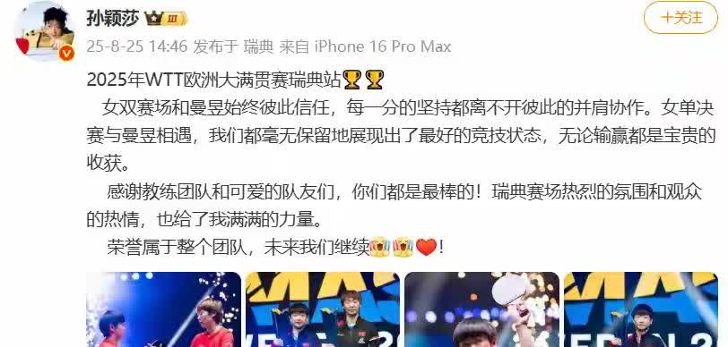 陈幸同最新动态呈现出来了,讲了一句总结非常到位的一句话! 陈幸同表示,团结一心,其利断金! 对的,只有团结一致,才能战胜强劲的对手。 欧洲大满贯赛,大藤沙月和张本美和组合就很强,也是打进决赛,但是,孙颖莎,王曼昱组合团结一致,配合默契,夺冠!