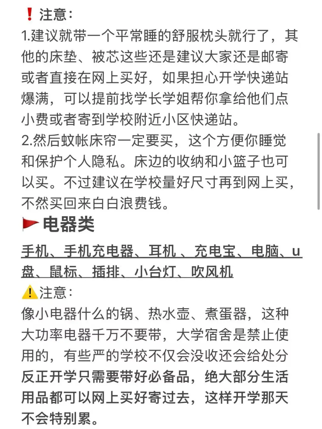 像小电器什么的锅、热水壶、煮蛋器,这种大功率电器千万不要带,大学宿舍是禁止使用的,有些严的学校不仅会没收还会给处分