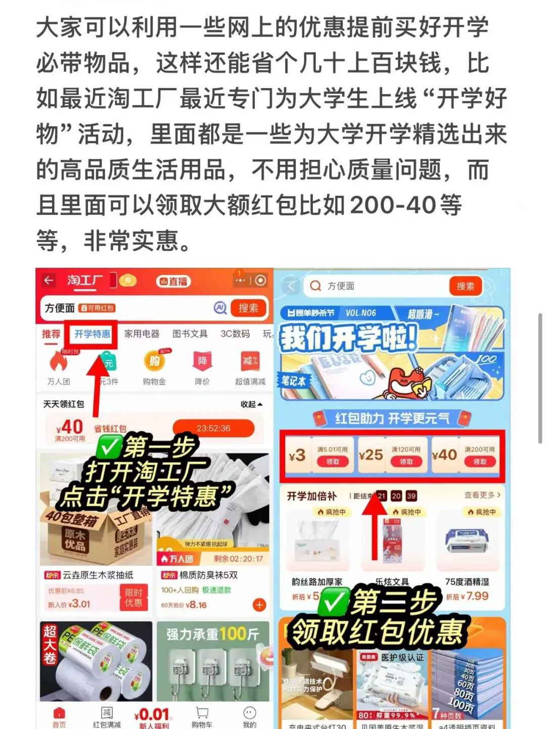大家可以利用一些网上的优惠提前买好开学必带物品,这样还能省个几十上百块钱,比如最近淘工厂最近专门为大学生上线“开学好物”活动,里面都是一些为大学开学精选出来的高品质生活用品,不用担心质量问题,而且里面可以领取大额红包比如200-40等等,非常实惠。