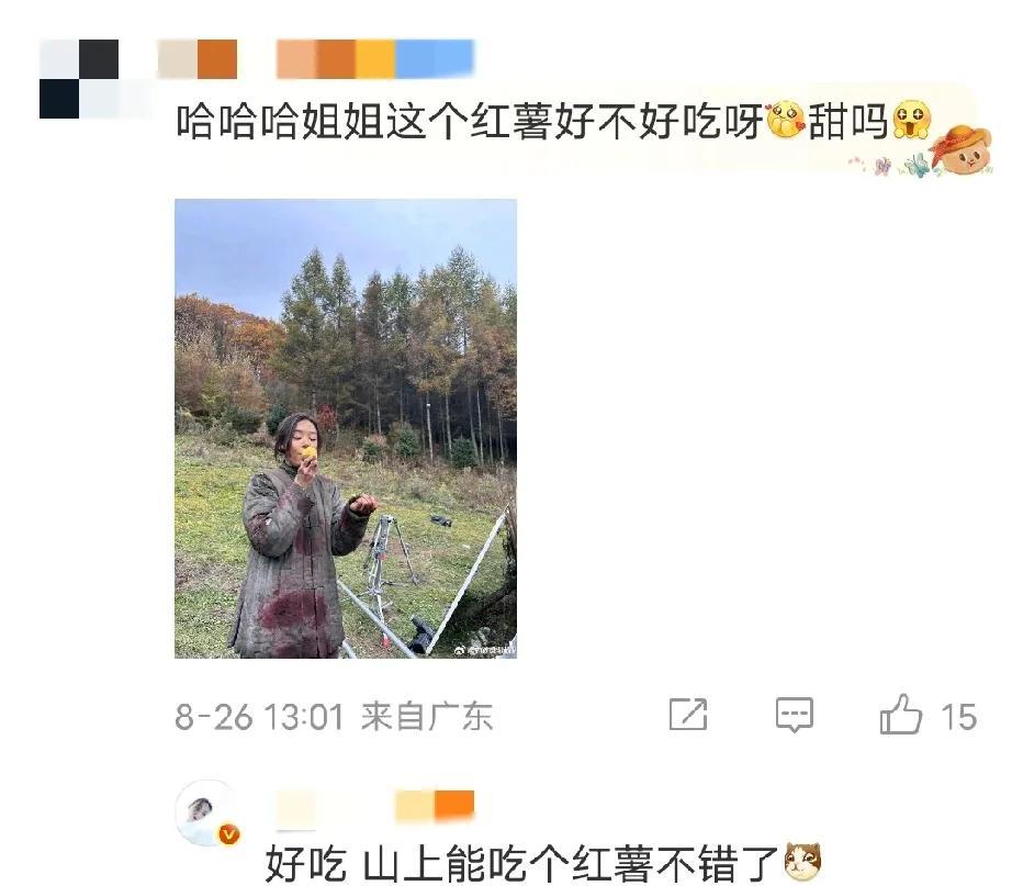 女明星放下包袱真的用, 不信你看袁姗姗,不晒精致感,不晒定制款,主打就是一个入乡随俗! 又是一年开学季,娱乐圈的女明星也纷纷开始进组给大家交作业了,没想到的是袁姗姗没等其他女明星反应过来就接了个央视大剧《归队》。 虽然和胡军、李乃文等实力派对戏颇有压力,可是看到她在戏外开心地吃着烤红薯、逗狗样子,顿时感觉她把山里拍戏的苦日子过成了蜜。 这戏里戏外的反差感,直接把她最真的一面带给大家,果然是收获不小[比心][比心] 秋日生活打卡#