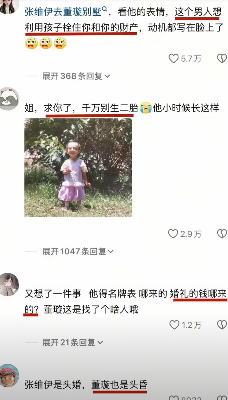 现在的网友真的是一届比一届有才,网友调侃董璇和张维伊的婚姻情况,真的是毫不嘴软: ①董璇和张维伊适合中午在一起,因为早晚得离。 ②张维伊是头婚,董璇是头昏。 ③董璇,这个婚是非结不可嘛? ④老哥,咱是样样都拿不出手啊! ⑤他们说是董璇的经纪人没着了,所以给她报了这个节目,想让网友骂醒她。 ⑥我也是出息了,董璇看上的男人,我居然都看不上。 ⑦张维伊节目上戴的耳机,品牌方不干了,因为好多退货的,哈哈哈哈哈反向带货第一人。