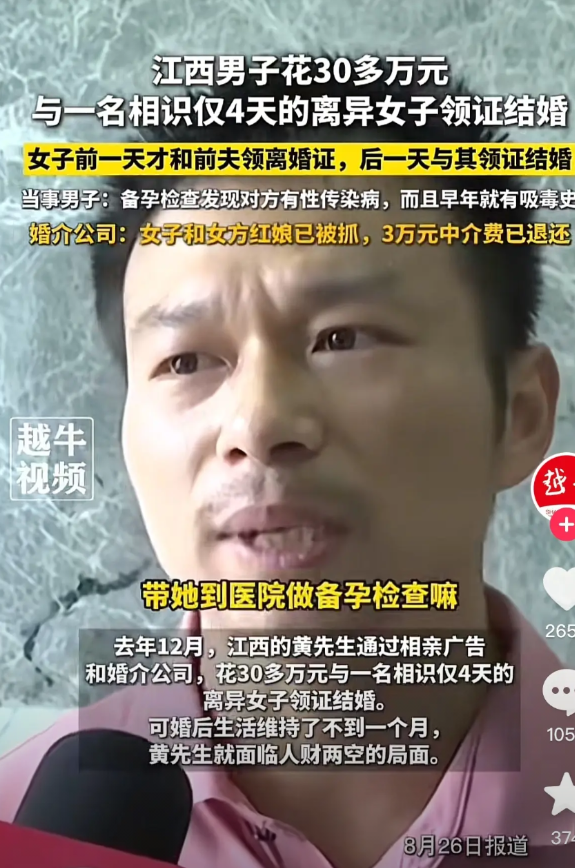 “这得多着急!”江西一男子刷短视频被相亲广告吸引,后经过平台前后总共花30万元和刚认识的4天的女子结婚,不料两人想备孕,去医院检查发现女子有性病,还发现女子13岁开始就已经吸du,男子的天快塌了。网友:大姨妈都要来7天 他认识4天就结婚了。