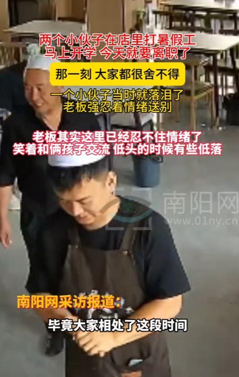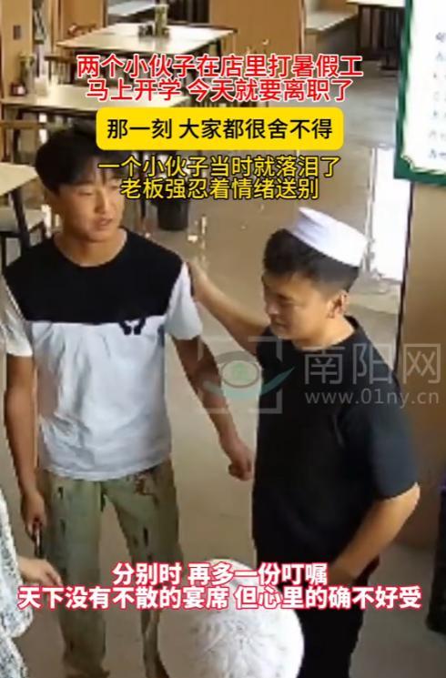 眼泪止不住了!8月20日,甘肃,2名男孩在饭店打暑假工,现在要开学了,他们只好向老板提出辞职,可是就在他们走的时候,一番举动让老板想哭!网友:这样的老板生意不火,天理难容,这样的男孩必定成大器! 这天,有家饭店,最近俩月常能看到两个年轻小伙子的身影,他们是来打工的学生,眼瞅着要假期结束了,也到了跟老板说再见的时候,这俩男孩看着也就十六七岁的模样,暑假一开始就来饭店帮忙了。 每天天不亮就到店里,啥活都干得勤快,老板看他们年纪小还这么踏实,平时也特别照顾,饭点忙不过来的时候会多搭把手,到了饭点还总让后厨给他们多盛点肉。 他怕孩子正是长身体的时候吃不饱,眼瞅着开学日期越来越近,俩男孩心里犯了嘀咕,想着得跟老板说辞职的事儿,下午不忙的时候,他们红着脸找到老板,小声说了想辞职回学校准备开学的想法。 老板一听,心里先是咯噔一下,随即笑着点头,说早就想着他们回学校了,让他们放心,工资会一分不少给,到了俩男孩收拾东西要走的那天,他们没空手来,俩人手里提着几箱牛奶,一进饭店就往柜台边放。 说是一点心意,大哥看着那几箱牛奶,嘴上说着“你们这孩子,瞎花钱干啥”,可眼眶一下子就热了,他强忍着没让眼泪掉下来,正说着话,老板看见其中一个男孩偷偷哭了。 他怕自己控制不住,赶紧说“你们等着,我去后厨给你们做点吃的”,转身就进了后厨,等饭菜做好,老板又反复叮嘱他们开学后好好读书,有空了常来店里看看。 后来这事儿被其他顾客传到网上,网友们都夸开了,有人说 “这俩男孩懂感恩,以后肯定有大出息”,也有人说肯定是老板平时就对他们很好。 信息来源:《都是特别重情重义的人》南阳网