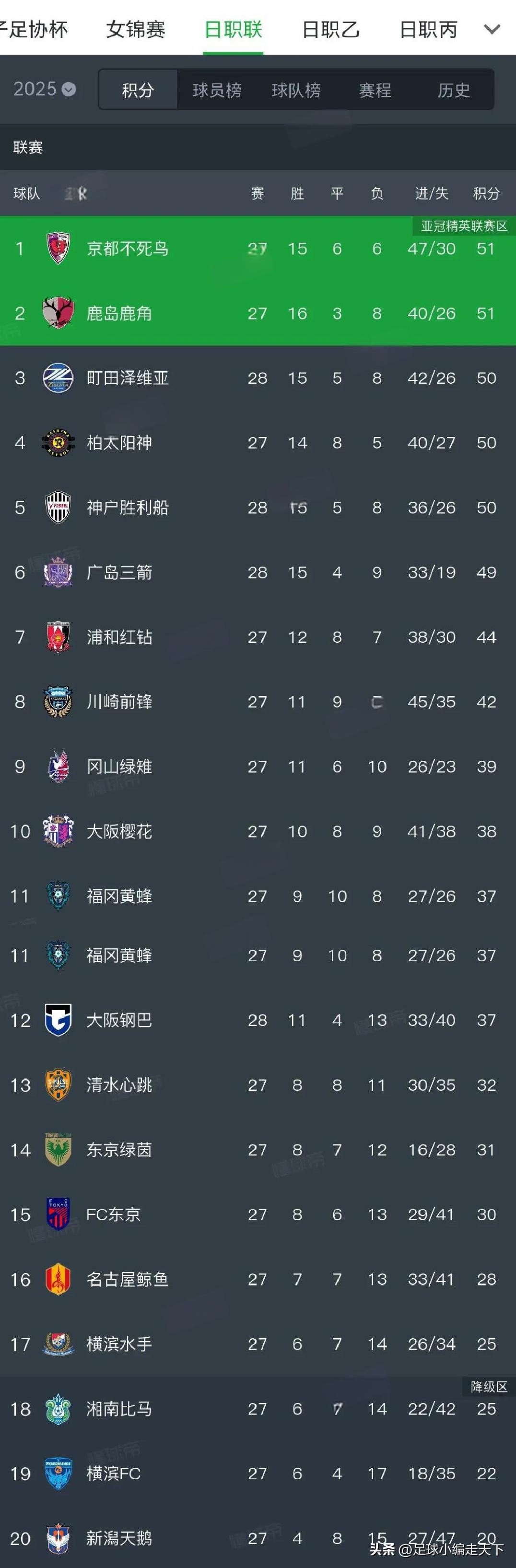没想到小日子J联赛的争冠区比咱中超还刺激啊。争冠区6选1(相差2分),保级区8选3(相差6分)。 横冰水手终于逃离了降级区。之前我还一度以为他今年必降级呢。 中超这边争冠也很胶着。上海申花49分领跑,北京国安和上海海港48分紧随其后,成都蓉城47分排在第三。 我个人觉得中超冠军还是在申花和国安这两队之间产生,当然还要看泰山队这个“审判官”的脸色才行。 中超保级区也变数多,亚泰和海牛跟深圳和梅州目前只差2分了。我个人还是看好亚泰保级成功。