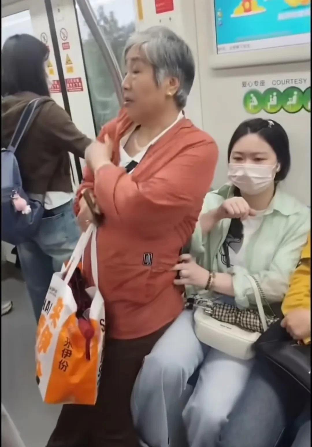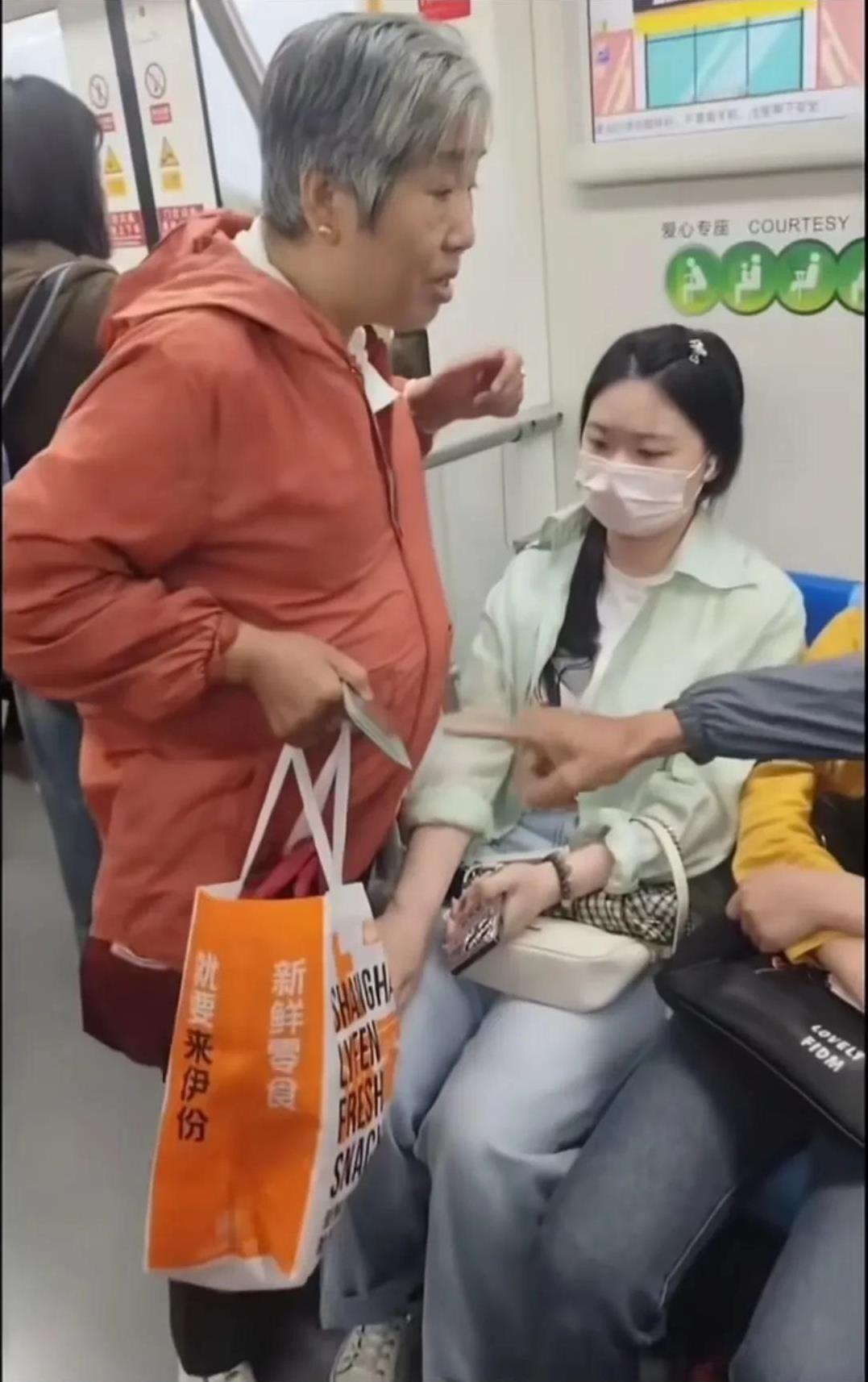 上午的地铁里满是上班族。途中,一位大妈拿着老年证免费上车后,立马要求一名年轻女子