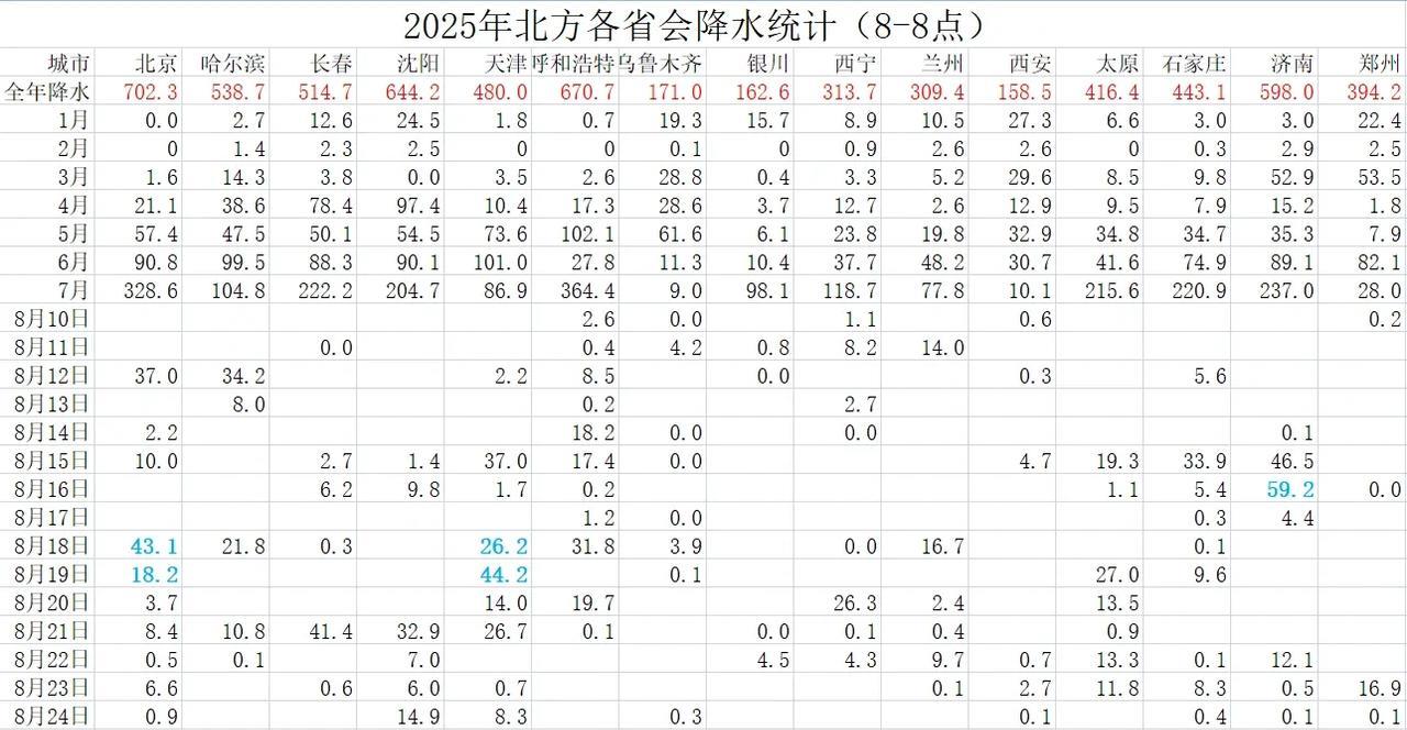 目前,北京年水量已经突破700mm大关,月水达到200mm以上;而呼和浩特年水超
