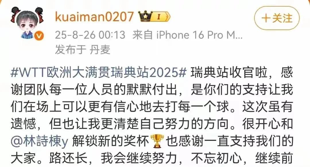 林诗栋发声了! 最大的收获是获得混双冠军。锻炼了心理,磨炼了意志,增强了信心。
