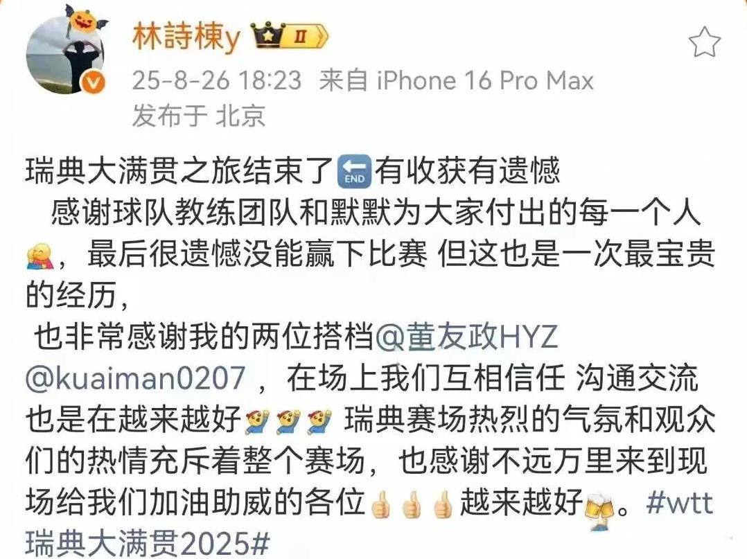 林诗栋发声了! 最大的收获是获得混双冠军。锻炼了心理,磨炼了意志,增强了信心。 遗憾来自男单和男双。两个亚军也不错,但还是没达到目标。下一步还要多努力。 遗憾之后不忘感谢。感谢搭档蒯曼、黄友政,感谢热情的观众。 祝贺林诗栋蒯曼。 希望看到更强大的你们。