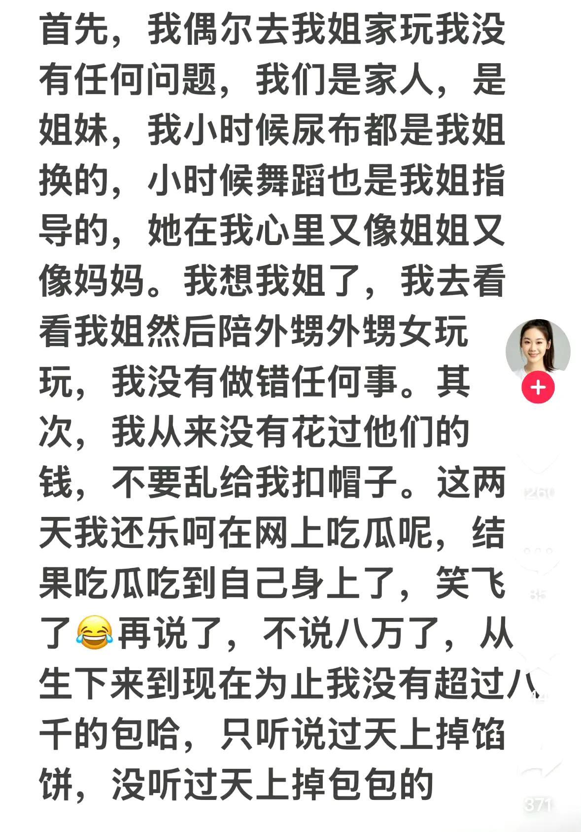 苗苗妹妹忍不住自己出来回应了,发文称自己没有做错任何事,从来没有花过郑恺苗苗他们家的钱,不要乱扣帽子! 现在素人妹妹也不得不发声,妹妹表示和姐姐关系很好,姐姐从小就特别照顾自己,调侃吃瓜吃自己身上了,自己从出生到现在没有超过八千的包,别说八万了……#苗苗# #郑恺#