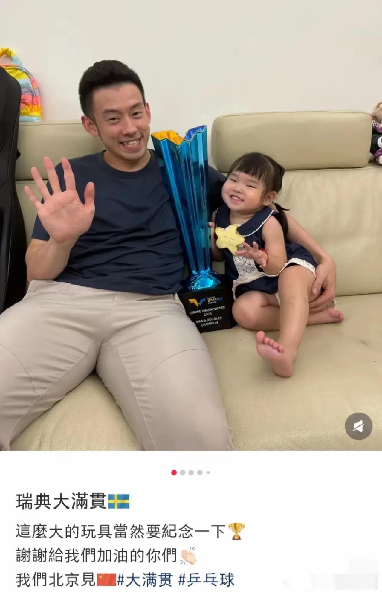 黄镇廷的女儿是大圣福星啊,很旺父亲。 女儿又有新玩具了, 大圣这属于老来得奖啊! 等了十几年,终于等来了他的小男左陈灏桦,俩人拿了瑞典大满贯赛事男双冠军,很有含金量的一站比赛,港队这俩连续击败了日本队张本智和组合,韩国林钟勋/安宰贤组合,国乒石油组合。