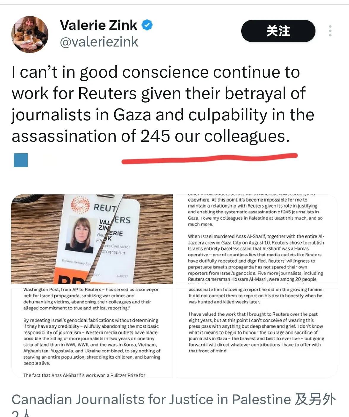今天又一位路透社签约摄影记者现场剪了自己的记者证,质疑路透社以及自己同时供稿的其他媒体纽约时报、华邮、美联社等等,就是以色列的传声筒。 【我的良心过不去这一关】她写道,【鉴于路透社对245名记者同僚们的背叛,我已无法继续为路透社工作】——这里指的是西方媒体在加沙被以色列蓄意定点抹除的记者们,加上前天在医院废墟中救援的数名记者,总共245位。(实际上昨夜又多加了一位,共246位) 在她的声明中,言辞犀利地指出西方媒体就是以色列宣传工作的传送带,自己的同僚会有更多人站起来。让我们拭目以待西方记者是不是真的都有种吧。