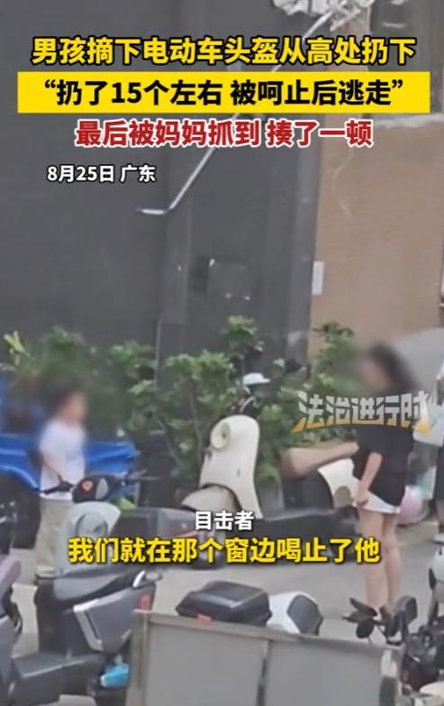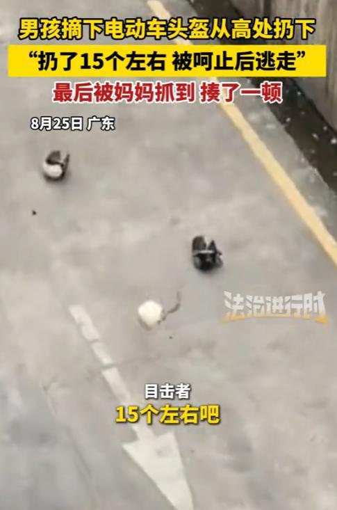 “熊孩子该打!”8月25日,广东,一小男孩在停车场玩,突然想要惹事,竟摘下别人的电动车头盔,从高处扔下,连续扔了15个,路人实在看不下去,出面呵止,结果,孩子却跑掉,好在被妈妈抓到,揍了一顿,网友:别忘记把15个头盔给赔了! 这个停车场跟别的不一样,它比下面的路面要高一层,相当于站在小楼上往下看,有个小男孩在停车场里玩,本来好好的,不知道怎么突然就想惹事了。 他看见停在旁边的电动车上都放着头盔,竟伸手把别人的头盔一个个摘下来,然后使劲从高处往下扔,一开始大家还没注意,等有人发现的时候,这孩子已经扔了好几个。 头盔掉在下面的地上,“啪”的一声就碎了,好好的东西直接就不能用了,更让人担心的是,下面还有路人来往,要是头盔砸到人,那后果可就严重了,轻了头破血流,重了说不定还得住院。 有路过的人看着这孩子没个停手的意思,扔一个又一个,总共扔了15个头盔,实在忍不住了,就大声呵斥他,让他赶紧停下来,这孩子一听有人说他,立马就慌了,拔腿就往停车场里面跑,想躲起来。 好在停车场有物业的人,孩子妈妈也很快赶了过来,几个人一起找,没多久就把这孩子找到了,孩子妈妈看到地上碎了一地的头盔,又听路人说了刚才的事儿,气得不行。 当场就把孩子拉过来揍了一顿,也让孩子知道闯了大祸,这事传到网上后,网友们都觉得这孩子该管管,有人说“打得好,不然下次还敢犯更大的错”。 还有人提醒,可别光揍孩子就完了,头盔都是别人花钱买的,必须得照价赔给人家,这样才能让孩子真正记住教训。 信息来源:《男孩摘下电动车头盔从高处扔下“扔了15个左右被呵止后逃走”最后被妈妈抓到揍了一顿》法治进行时