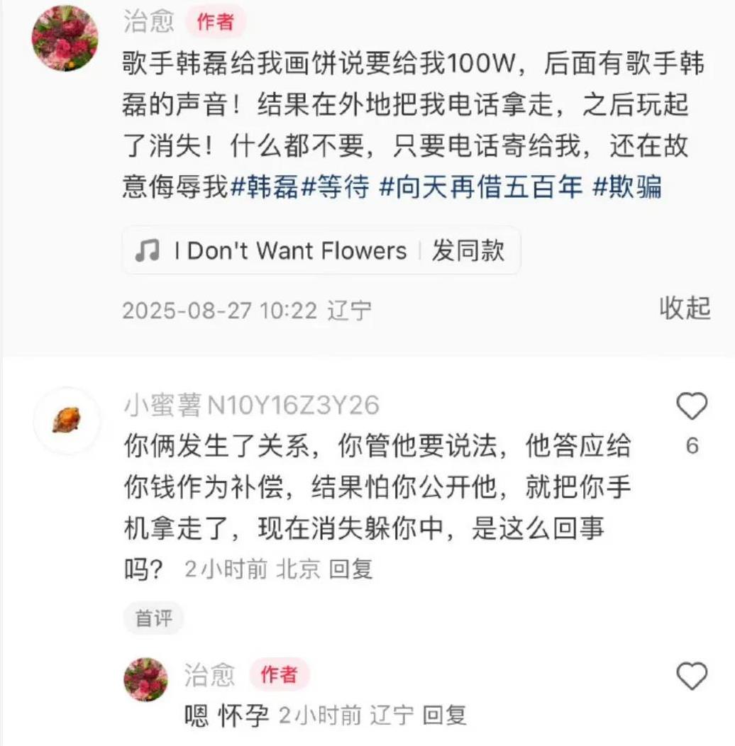 今天最大的瓜,是歌王韩磊的! 8月27日,突然有女网友在网上放了录音和照片控诉著名歌手韩磊,说她怀了韩磊的孩子,然后韩磊承诺给她100万,但是突然又反悔玩起了消失,并且为了防止她曝光,还抢走了她的手机,现在她要求韩磊还她手机。 网友得知后非常惊讶: 老人瓜吃起来真咯牙。 老一辈的娱乐圈可比现在乱多了。 老一辈你想不到的玩的花,只不过那时候网络不发达,没被曝光。 他喝酒多年这个岁数,大概早就没有X能力了吧。 记得他当年有偷税漏税的新闻来着,后来不了了之了。 这种老艺人更容易塌方,毕竟没有私生狗仔跟踪。 韩磊出生于1968年,今年58岁,很早就出道的他曾凭借《走四方》和《向天再借五百年》大红大紫。 他的妻子琪琪格出生于1984年,今年42岁,比韩磊小16岁,琪琪格2005年参加过我型我秀,当年她的男友是同届我型我秀的选手格里杰夫,两人挺郎才女貌的。后来再看到琪琪格,就是我是歌手时期,才知道她成了同样来自内蒙古的韩磊的老婆,还有了一儿一女两个孩子,俩人岁数差挺大的,我还觉得当时的韩磊就应该老婆应该岁数也不小了,没想到居然娶个选秀的,跟他老艺术家风格不太搭。 虽然不知道爆料是否属实,但是是真的也别意外,不要把他们这种老艺人想的那么高尚,娱乐圈明星都是包装的产物,真实人品未必是大家看到的样子。