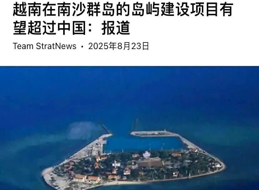 越南把八个礁一夜推成岛,只为把南海变成自家后院。 外媒卫星图显示,六门礁、鬼喊礁、东礁等原本巴掌大的混凝土碉堡,如今被推土机啃得只剩轮廓,沙袋、管道、混凝土块像积木一样堆出陆地。 2021年还只有11座碉堡,如今21座全戴上“人工岛”帽子,规模冲到中国的七成。 柏礁上三处弹药库围着新跑道,摆明告诉邻居:我不仅能停船,还能停飞机。 越南赌的是时间差——趁中美谈判、趁台风季视线模糊,把既成事实钉死在海图上。 填出来的每一块地,都能让渔船、雷达、导弹往前挪一步,把别人的专属经济区切成碎片。 中国外交部8月25日把话挑明:岛是我的,施工必停。 这不是第一次警告,却是最短的一次。 短,是因为话已说尽;硬,是因为底线已画。 下一步,巡逻机绕岛、海警船贴岛、外交照会叠岛,都是选项。 越南若以为沙子能堆出主权,那就试试看,海潮和规则谁先到。 你觉得填出来的岛能住几天?