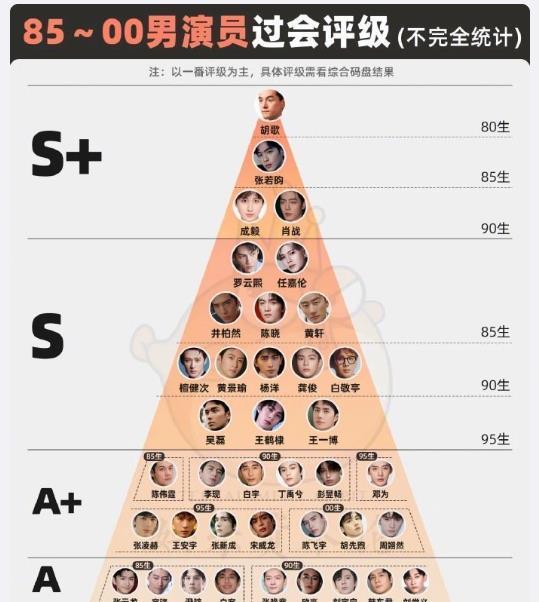 #胡歌张若昀成毅肖战S加男演员# 一番S+男演员第一梯队的是胡歌、张若昀、成毅、肖战;S第二梯队的男演员是罗云熙、任嘉伦、井柏然、陈晓、黄轩、檀健次、黄景瑜、杨洋、龚俊、白敬亭、吴磊、王鹤棣、王一博;A+第三梯队的男演员是陈伟霆、李现、白宇、丁禹兮、彭昱畅、邓为、张凌赫、王安宇、陈飞宇、胡先熙、张新成、宋威龙、周浩然;A第四梯队的男演员是张云龙、刘宇宁、刘学义、胡一天、王星越等。