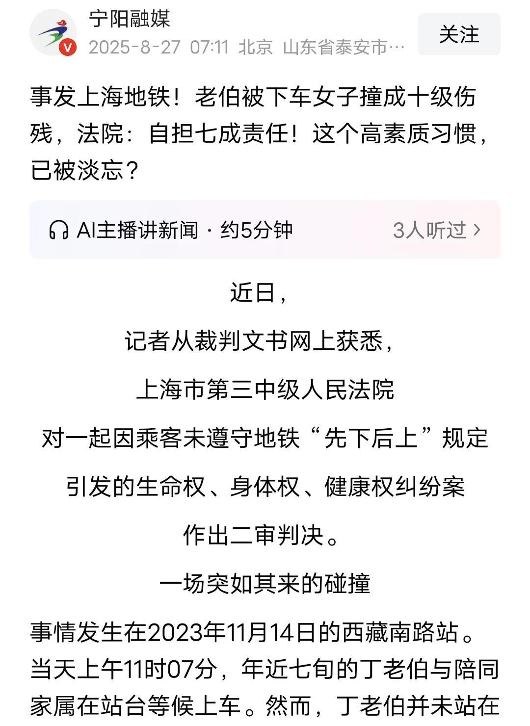 “冤吗?”上海,老人在地铁等车,身后一男子,抢他前头上了车,偏巧,一女子下车和上车的老人撞到一起,老人摔倒,被送医院,诊断为10级伤残,事后,老人把女子、地铁方告上法院,索赔28.4万,法院判决女子承担30%的责任,网友:正常下车还有责任?这女子太倒霉! 8月27日宁阳融媒报道,在上海地铁西藏南路站发生了一场意外。 2023年11月14日这天上午,11点07分时,快70岁的丁大爷在家属陪同下,一起在站台上等车。 丁大爷当时站在了下车区域等车,却没有站在规定好的上车区域。 车来了,就在车门一开的那一刹那间,突然涌过来好多乘客,大家都着急忙慌地想快点上车。 根本没有想到“先下后上”这个基本的规则,于是,意外也随之发生了。 丁大爷身后站着一个男子,他一看车来了,大跨一步,快速抢在丁大爷前面就上了车。 偏巧在这个节骨眼上,正准备下车的袁女士和正要上车的丁大爷“咣当”一下撞到了一起。 丁大爷一个没站稳,“扑通”一声摔倒在地上。 袁女士一看立马慌了神,和地铁工作人员急忙把丁大爷搀扶起来,和火急火燎把他送去了医院。 到医院一检查,丁大爷摔的可不轻,诊断结果是丁大爷右股骨粗隆间骨折,后来,鉴定认定是十级伤残。 丁大爷出院后,觉得这事是袁女士的责任,是她下车的时候没有注意,才导致自己摔倒受伤。 自己住院所有的医疗费用一共是28.4万元,袁女士得赔偿。 另外,丁大爷认为,地铁方没有及时疏导人流,没有尽到安全保障义务。 因此,丁大爷一纸诉状将袁女士,地铁告上法院,要求赔偿。 袁女士哪里能想到,祸从天降,她觉得自己是正常下车,丁大爷摔倒,是他自己没有遵守“先上后下”规则。毕竟,事发当时丁大爷站在了下车区域等车,却没有站在规定好的上车区域。 地铁方也喊冤,表示站里都设置特别明显的指示标识,丁大爷摔倒第一时间,工作人员也及时救助了,已经尽到了安全保障义务了。 法院查明,丁大爷在该车站候车的地方地上有金属材质油漆做的标识,清清楚楚规定了等候区域。 而且,《上海市轨道交通乘客守则》里也明明白白写着,乘客得在安全线内排队,先下后上,禁止强行上下车。 可丁大爷候车的时候站在下车区域,和下车的袁女士撞上了,这就是事故发生的一个重要原因。 1、丁大爷未遵守“先上后下”规则导致碰撞,要承担70%的责任。 《民法典》第1165条规定:行为人因过错侵害他人民事权益造成损害的,应当承担侵权责任。 本案中,丁大爷等车时,没有站在规划上车区域,违反了《上海市轨道交通乘客守则》中“先下后上”的明确规定,直接导致与下车乘客对冲。 法院认定,丁大爷存在主要过错,要承担70%责任,正是依据该法条中“过错责任”原则。 规则不是摆设,乘客违反公共交通秩序造成损害,需为自己的行为买单。 2、地铁方要承担责任吗? 《民法典》第1198条规定:宾馆、商场、银行、车站、机场、体育场馆、娱乐场所等经营场所、公共场所的经营者、管理者或者群众性活动的组织者,未尽到安全保障义务,造成他人损害的,应当承担侵权责任。 地铁方在站台设置金属标识、事发后及时救助,符合安全保障义务的法定标准。 法院最终认定,地铁运营方已设置指示标识、救助及时,所以,无需担责。 3、法院认为,袁女士下车时没有观察周围人流情况,有点疏忽大意了,承担30%的责任。 《民法典》第1173条规定:被侵权人对同一损害的发生或者扩大有过错的,可以减轻侵权人的责任。 法院认定袁女士下车时未谨慎观察周围人流,尤其是丁大爷站在下车区域这一异常情况。 作为完全民事行为能力人,她应预见拥挤环境中的碰撞风险,但未采取避让措施,因此存在过失。 丁老伯未遵守“先下后上”规则,站在下车区域导致对冲,是事故主因,故减轻袁女士的赔偿责任。 因此,法院认定袁女士承担30%责任。 最终,法院判决:袁女士对丁大爷的损害承担30%的责任; 丁大爷自行承担70%的责任; 地铁方已尽到法定职责,不需要承担责任。 袁女士要赔偿丁大爷多少钱呢? 本案中,丁大爷主张的医疗费用总额为28.4万元(含医疗费、护理费、伤残赔偿金等)。 袁女士赔偿责任比例为30%,28.4万元 × 30% = 8.52万元。 也就是说,袁女士要赔偿丁大爷8.52万元。 有人说,抢前丁大爷先上车的男士要承担责任,另外丁大爷未遵循先下后上的乘车规则承担主责。 没感觉袁女士有责任,倒是觉得袁女士挺倒霉的,正常下车怎么还要承担责任呢? 坐过地铁的都知道,大站、热站高峰期下车的时候,基本都是被一群人挤着推着出去的,谁能够提前预防不撞到谁呀! 所以,大家更应该留心观察,避免发生类似意外,惹上不必要的麻烦。 对此你怎么看呢? 关注@福康说法 从日常点滴学法律,生活安稳更有底