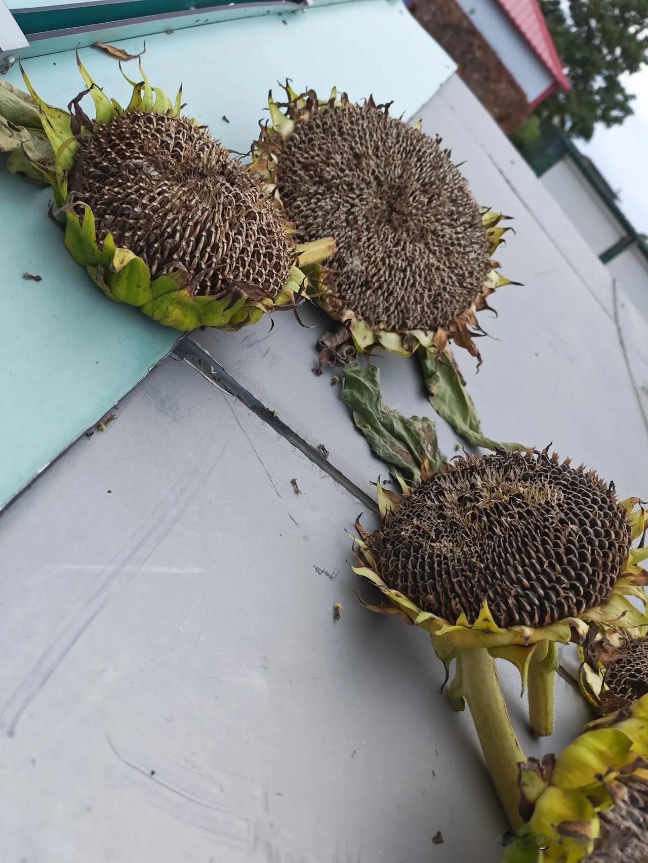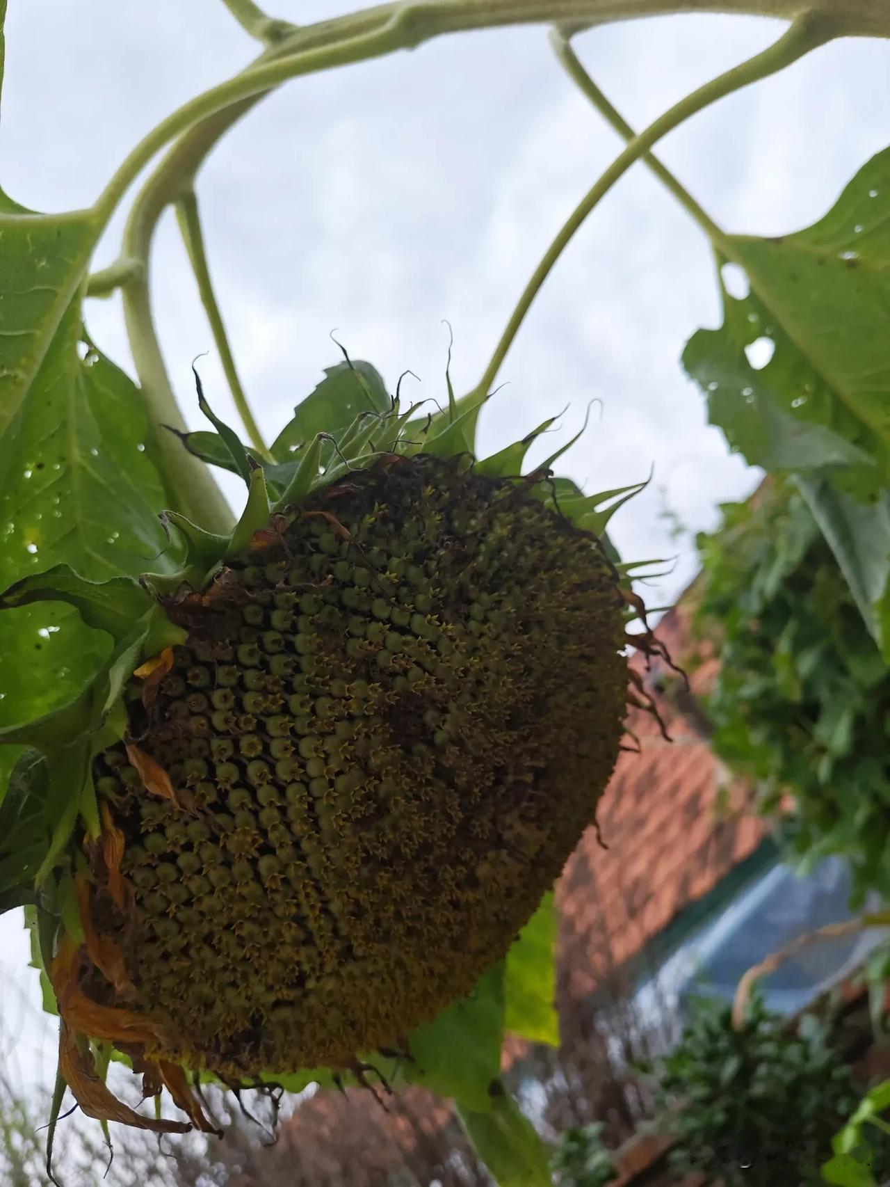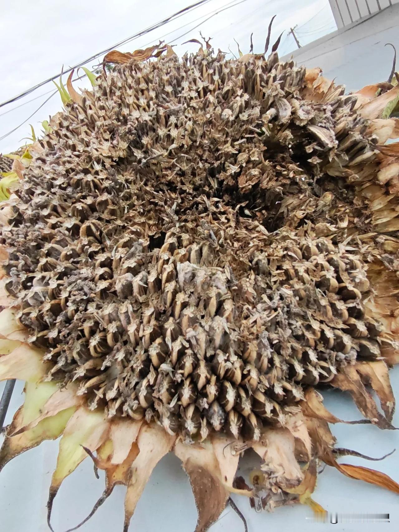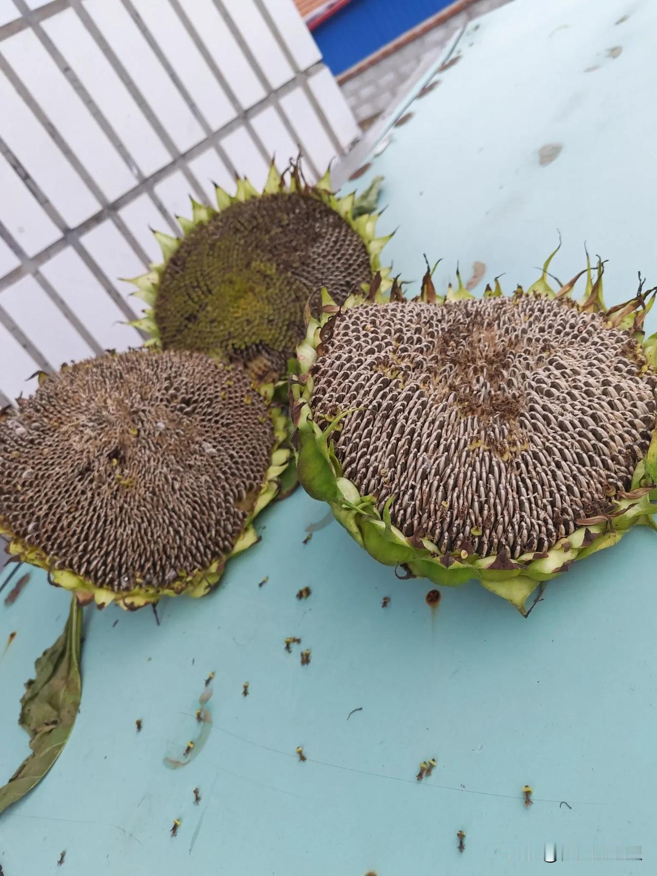 拔掉了很多,只留了四分之一的数量,就让它很随意地长。 也不知道啥时候能成熟,等几天大雨过去,发现有几个花盘都长毛了。 赶紧剪下来晾着,该说不说,那成熟的葵花籽长的挺大呢,这算意外的收获吧!