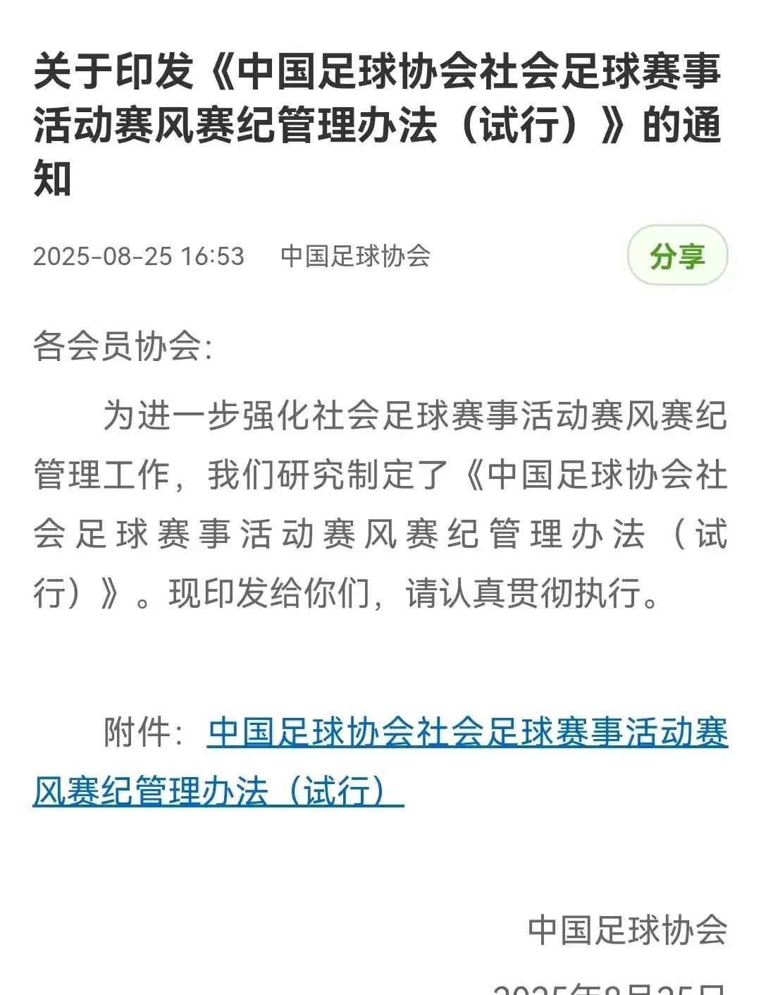 足协到底还是出手要切割民间足球的“蛋糕”了。 8月25日,中国发布《社会足球赛事管理办法》的通知,明确将民间组织的足球赛事统订为社会足球,而且将这种群众足球项目明确要纳入足协的管理范畴,不得不说要不是看到苏超和村超这些民间赛事生机盎然,投资商也是接踵而至,他们会这么大费周章的硬凑上去吗? 对于这个通告很多人嗾使嗤之以鼻,试想一个连自己份内之事都管不好的组织,看看职业联赛的乱局,看看日益拉胯的国家队成绩,就知道他们的工作效率多么不堪,如今却要插手民间组织的足球赛事,说白了就是要强行挤进去,借机分的一杯羹罢了。 可以预见,如果足协用行政手段强行介入苏超或者村超,那么这些活动项目离衰败的日子也就不远了![作揖][作揖][作揖] #记录我的2025#