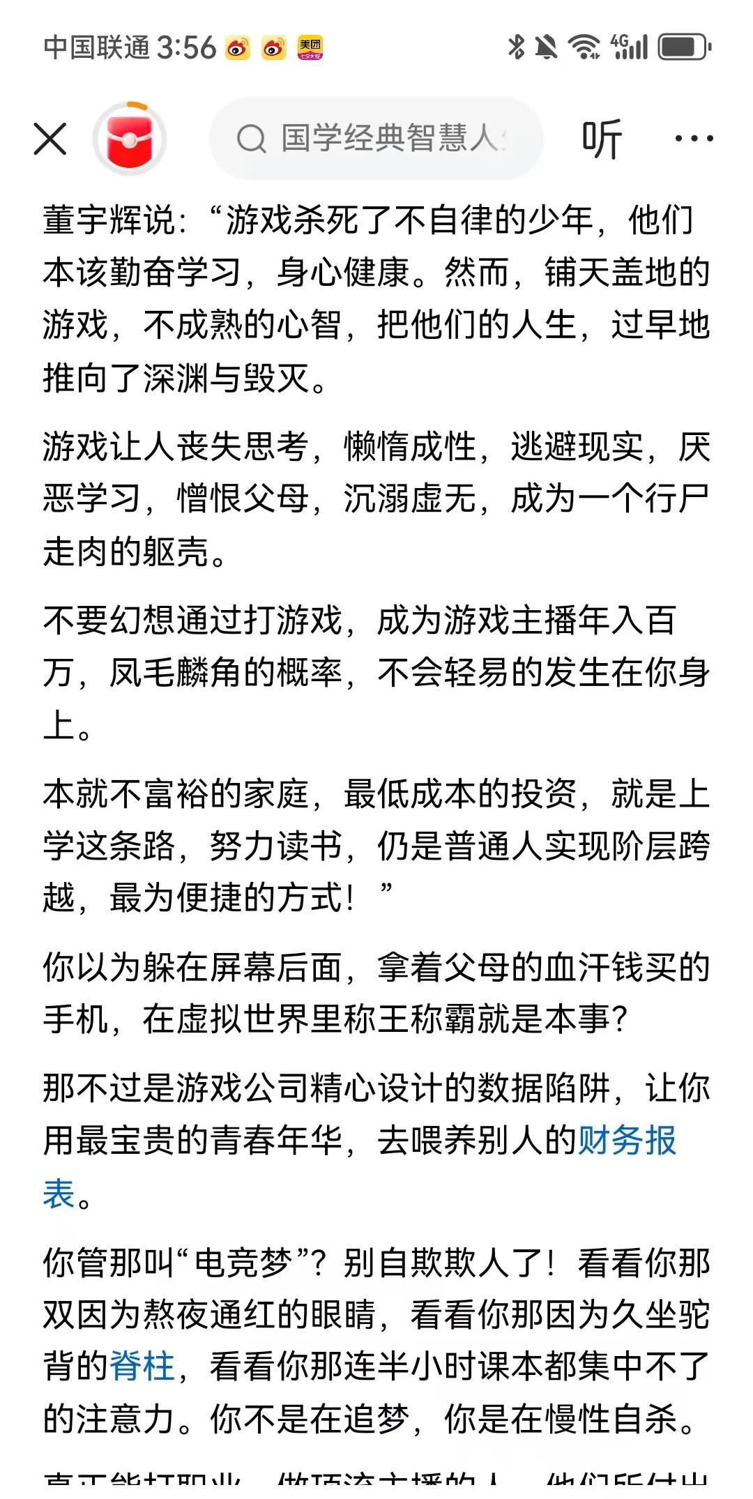 董宇辉说:“游戏杀死了不自律的少年,考清华的概率比当游戏主播还低,不还有一大群人