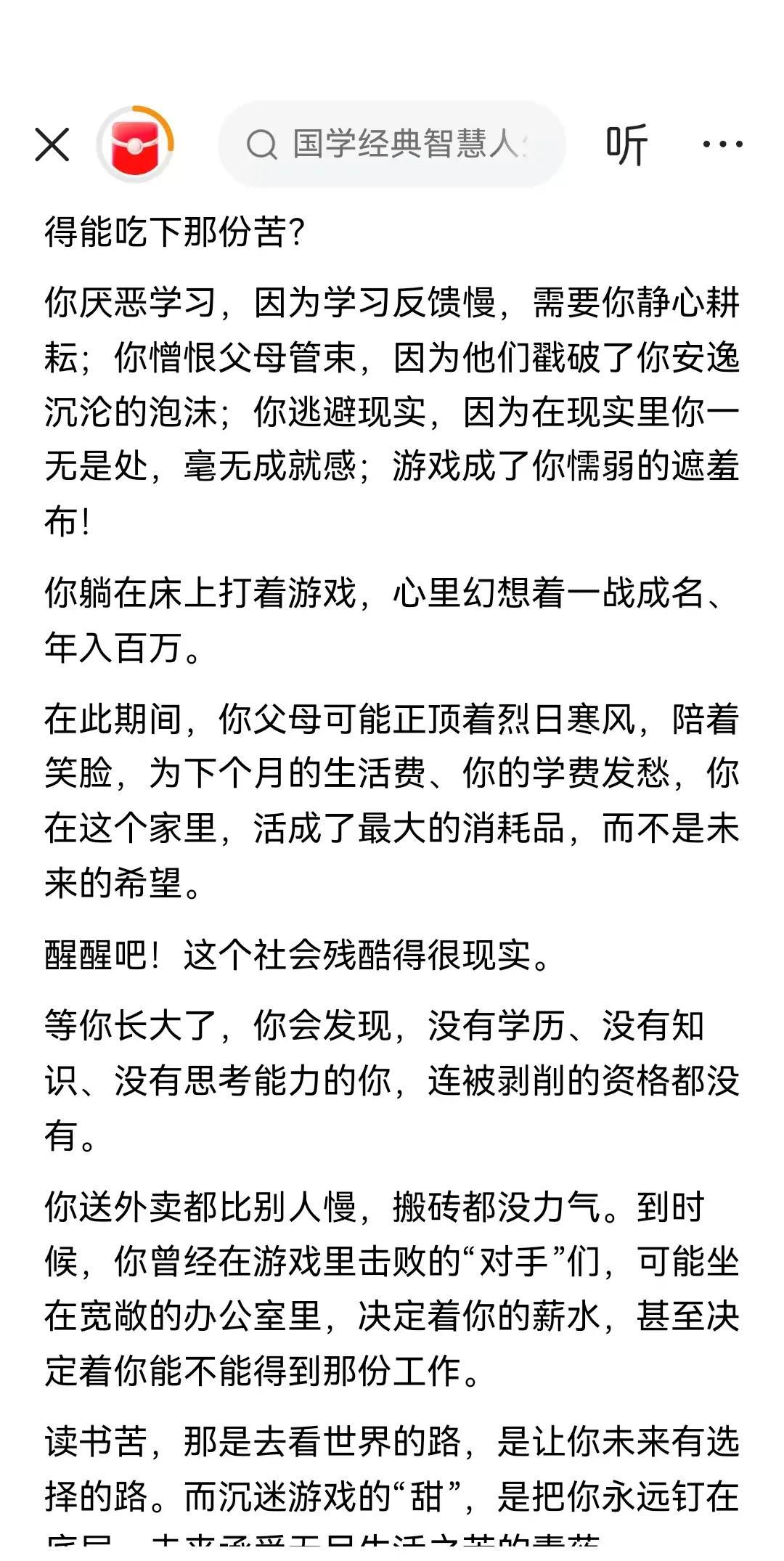 董宇辉说:“游戏杀死了不自律的少年,考清华的概率比当游戏主播还低,不还有一大群人前赴后继。其实女生当游戏主播还是很容易火的,前提真的打的好。 现在大学生太多,游戏就是为了淘汰掉那些不自律的人,不然那些脏活累活谁干。 其实,没有手机的年代,甚至没有任天堂或者街头游戏机,学渣依然是学渣。 我姐家孩子初中就因为玩游戏不想上学,父母都是老师,游戏危害太大了。 有几个孩子能听进去的,哎,一代不如一代。现在读书代价也挺大,大学学费都涨价了。 听君一席话胜读十年书,游戏容易让人上瘾,不如培养一个好的兴趣爱好,更接近梦想。