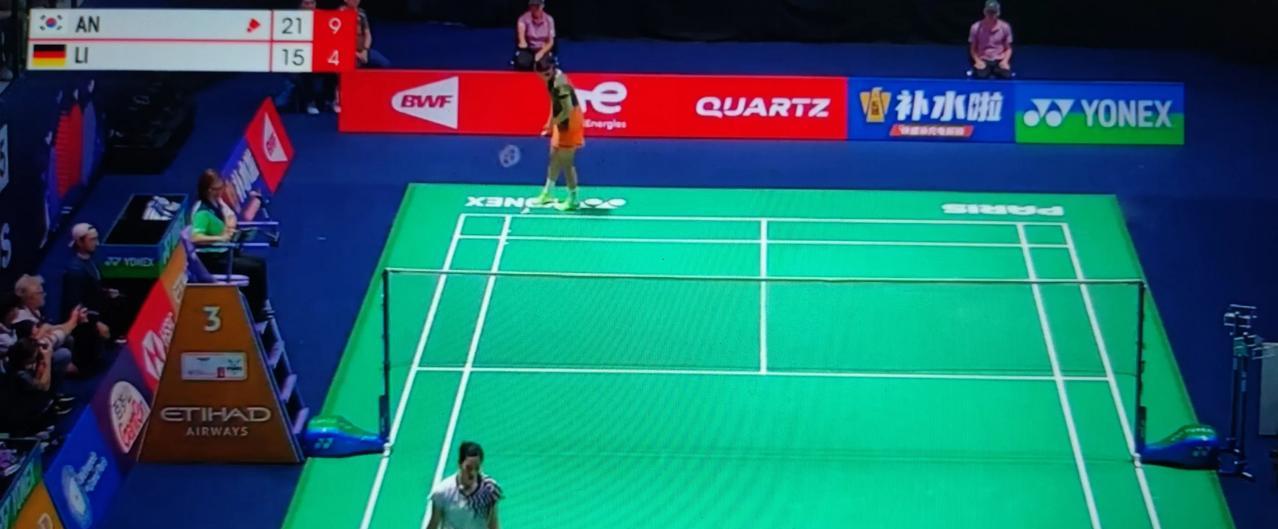 羽毛球世锦赛女单比赛,安洗莹对阵德国选手李怡逢。安洗莹21:15赢下首局,第二局