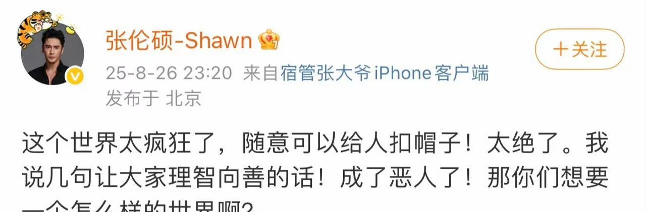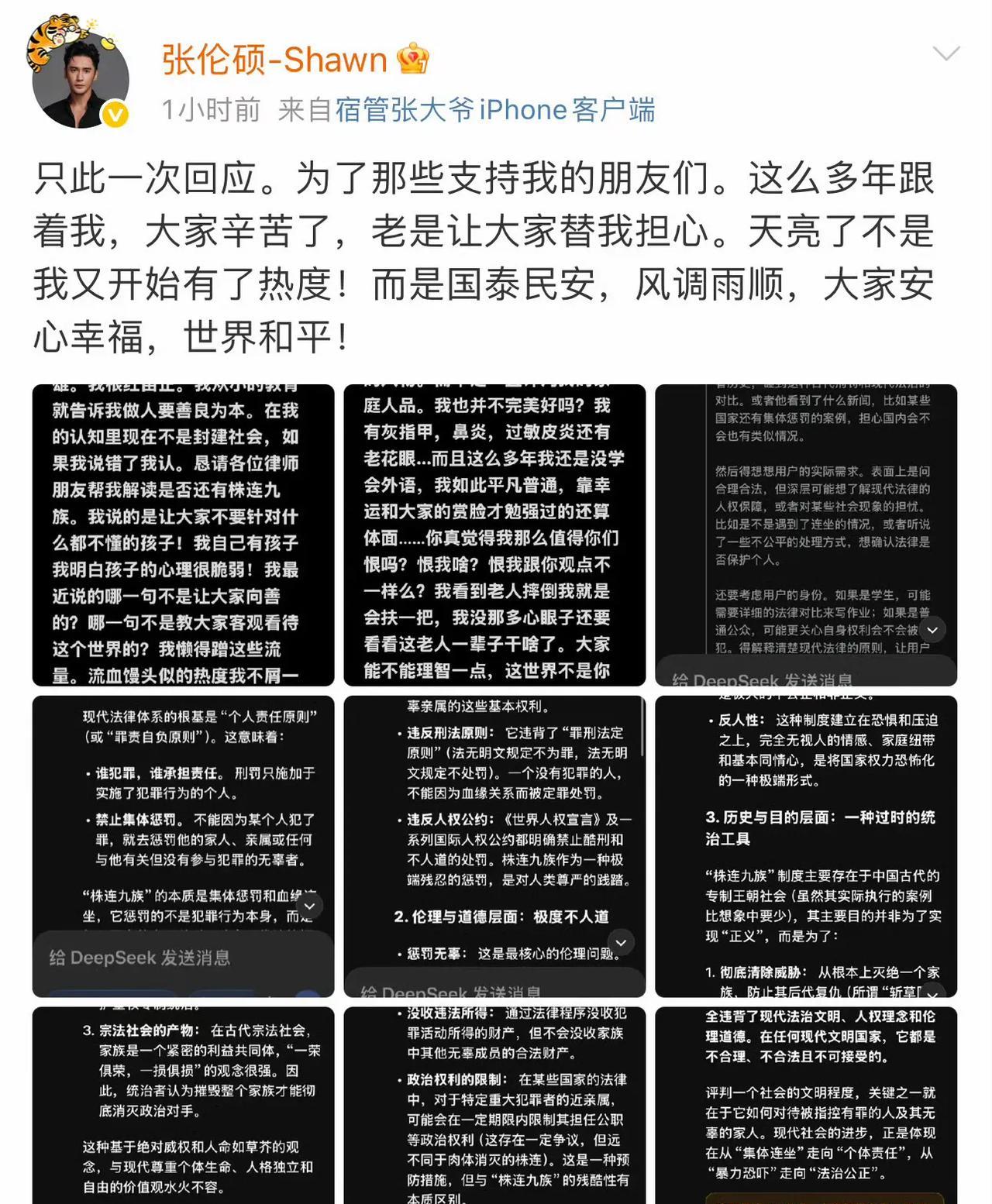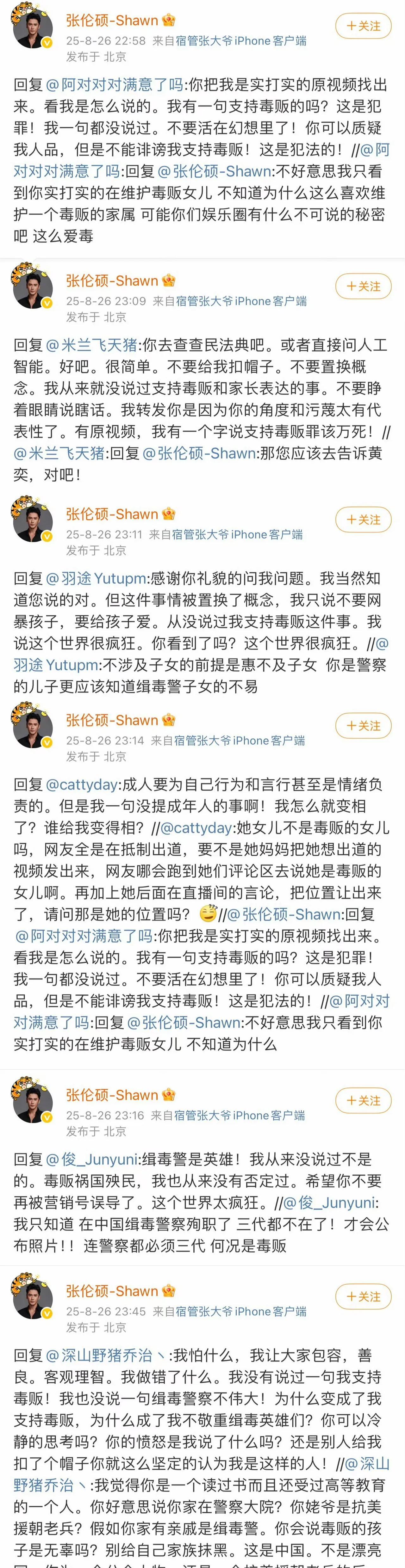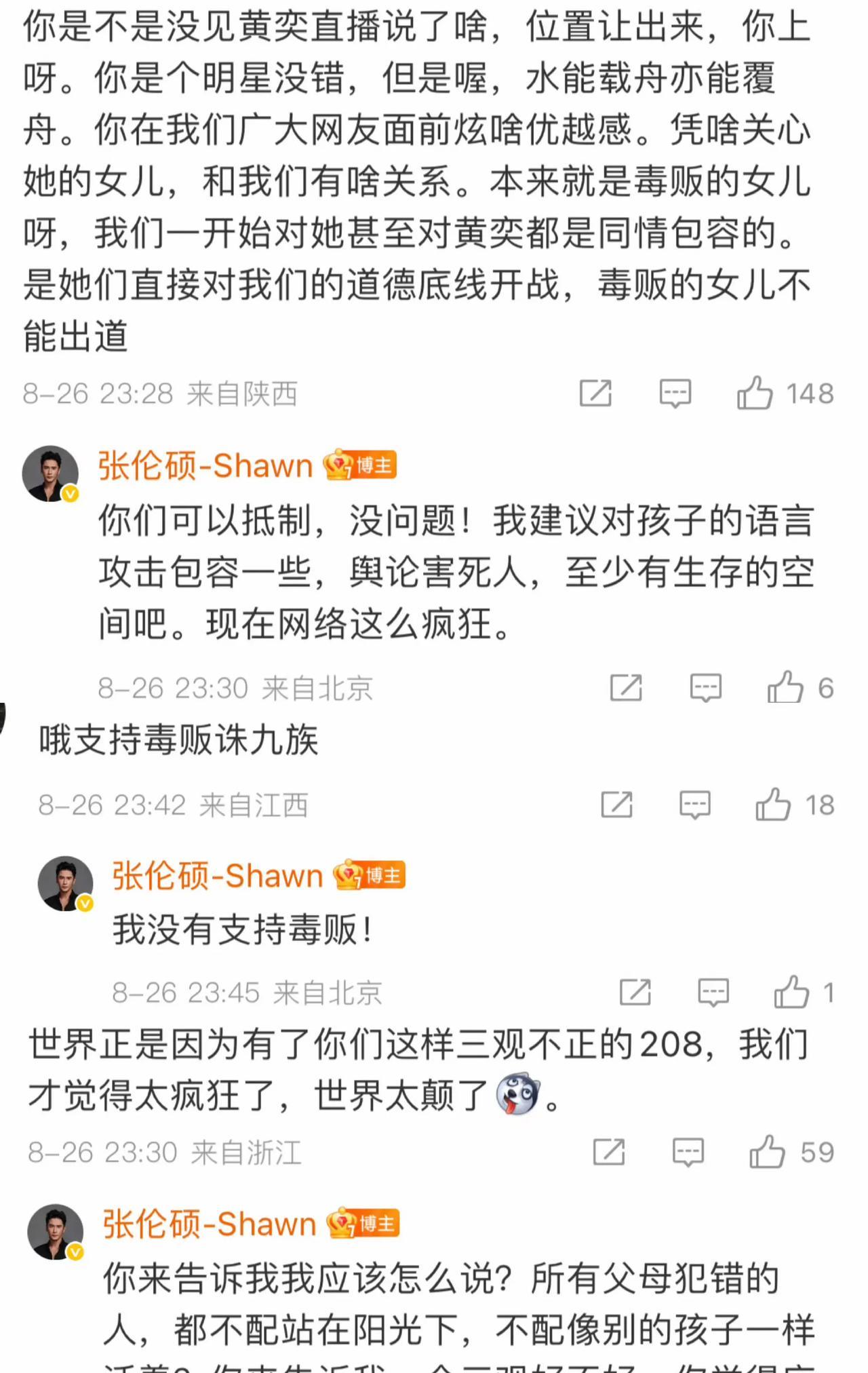 张伦硕疯狂和网友对线中…… 起因是前两天张伦硕直播谈到了黄奕女儿想出道被网暴这件事,他的原话是: “我的价值观崩溃了,为什么就网暴一个孩子,因为他的父亲不好。” “一个什么都不懂的孩子,我们不是应该呵护她吗?让她长太,给她希望,告诉她这个世界是美好的。” “这个世界太颠了,颠的我都看不懂了。” 这个片段的传播引发了争议,有网友说他在维护毒贩的女儿,对此张伦硕回应:“我说的是让大家不要针对什么都不懂的孩子!我自己有孩子我明白孩子的心理很脆弱。” 同时张伦硕强调自己根正苗红,并po出了“现代社会株连九族合理合法吗”的ai问答。 对于网友对他“爱毒”的声讨,他转发网友评论回复:“我有一句支持毒贩的吗?这是犯罪!”