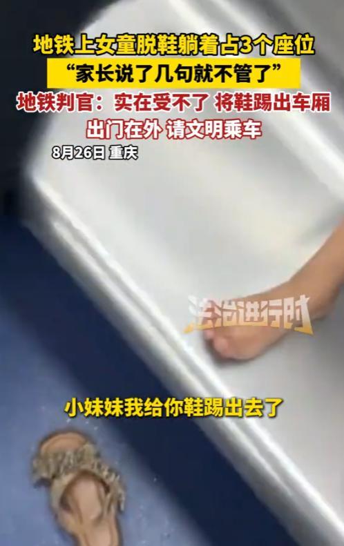 “小伙子出手了!”8月26日,重庆,一熊孩子在地铁上脱鞋,躺着占3个座位,不仅如此,还用脚踹别的人,而家长说了孩子几句,就不管了!一男子看到后,实在受不了,提前下站,把孩子的鞋踹出地铁外!网友:干的漂亮! 那天地铁里人不算少,不少人都是下班或者出门办事,想着找个座位歇会儿,可就有个小孩,看着也就五六岁的样子,一点儿不老实,他直接把鞋脱了,躺在座位上,一下占了三个位置,旁边人想坐都没地儿。 这还不算完,小孩躺着的时候,还不安分,用脚往旁边乘客身上踹,被踹的人皱着眉提醒,可小孩根本不听,依旧我行我素,旁边坐着的家长,也就随口说了孩子两句,之后就不管了。 要么低头看手机,要么看向别处,完全没把孩子的不当行为当回事儿,周围乘客看在眼里,心里都挺不舒服的,可都是陌生人,也不好多说什么,只能默默忍着。 这时候,有个小伙子实在看不下去了,他本来不是这站下车,可看着孩子这样,还有家长的态度,实在忍不了,决定提前下站,在下站之前,小伙子看了看那孩子,对着小孩说:小妹妹,我把你的鞋踢出去了。 然后就朝着地铁门外,一脚把孩子放在旁边的鞋踹了出去,做完这事儿,他没多停留,直接跟着人流下了地铁,后来这事儿被传到网上,有人说,现在有些家长太惯着孩子,公共场合不管教,就该有人治治。 也有人说,小伙子这做法虽然直接,但也是没办法,换做谁遇到这样的情况,估计都得生气,其实在公共场合,不管是大人还是孩子,都得守规矩,孩子小不懂事,家长更得好好教,不能放任不管。 信息来源:《地铁上女童脱鞋躺着占3个座位“家长说了几句就不管了”地铁判官:实在受不了 将鞋踢出车厢出门在外请文明乘车》法治进行时