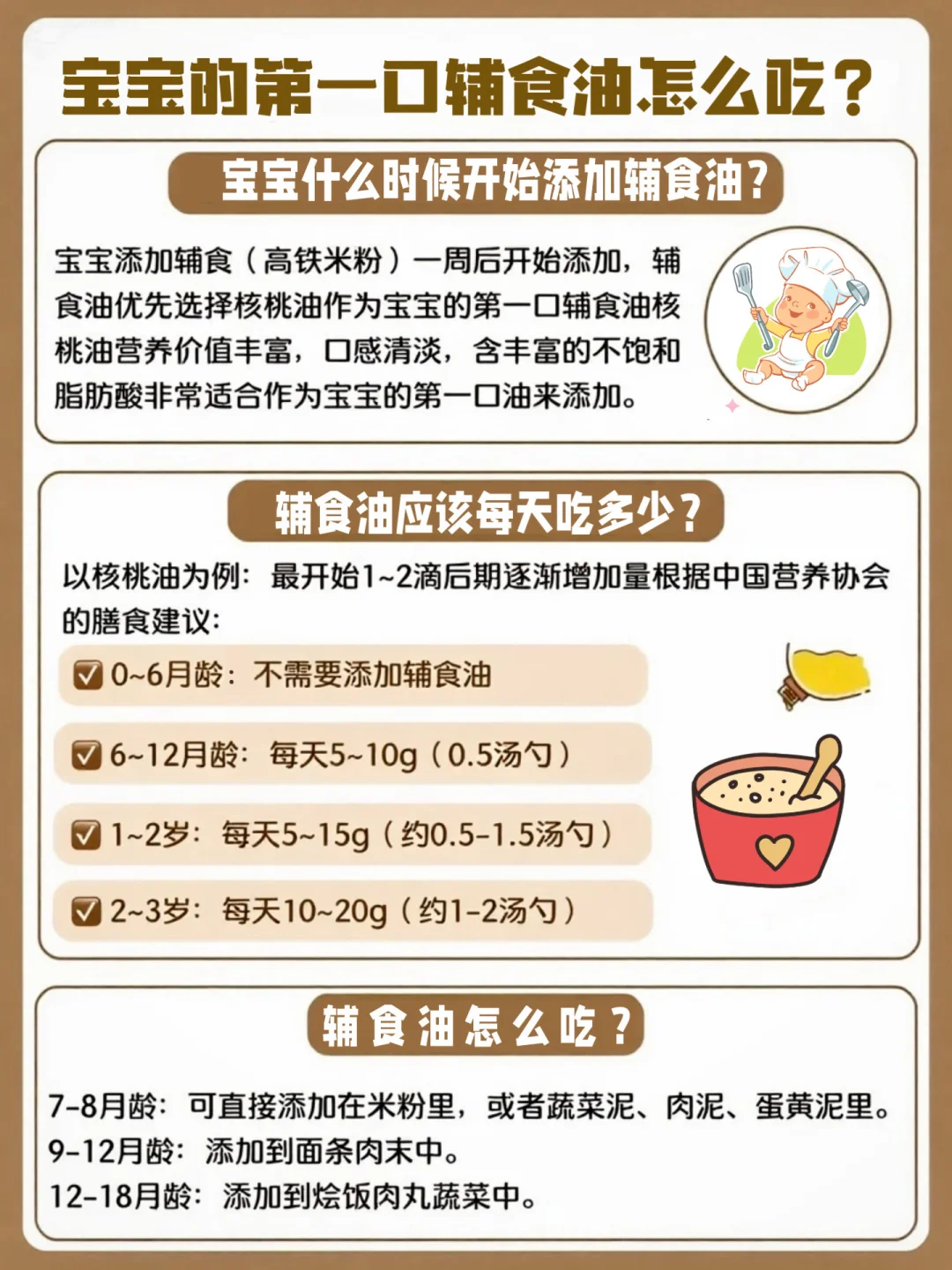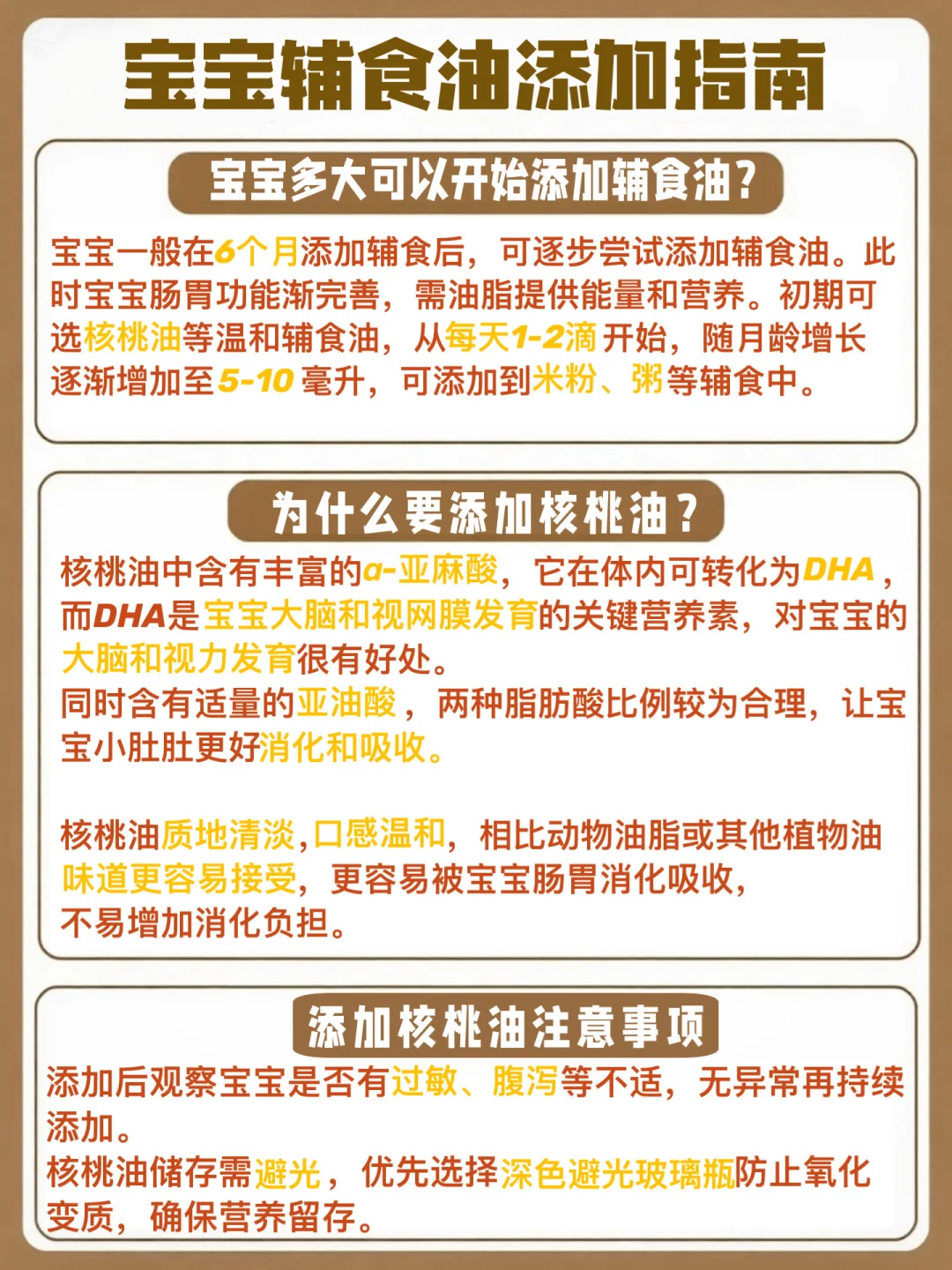 宝宝添加辅食(高铁米粉)适应一周后开始添加,辅食油优先选择核桃油作为宝宝的第一口辅食油