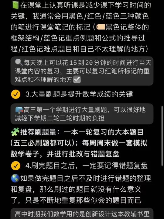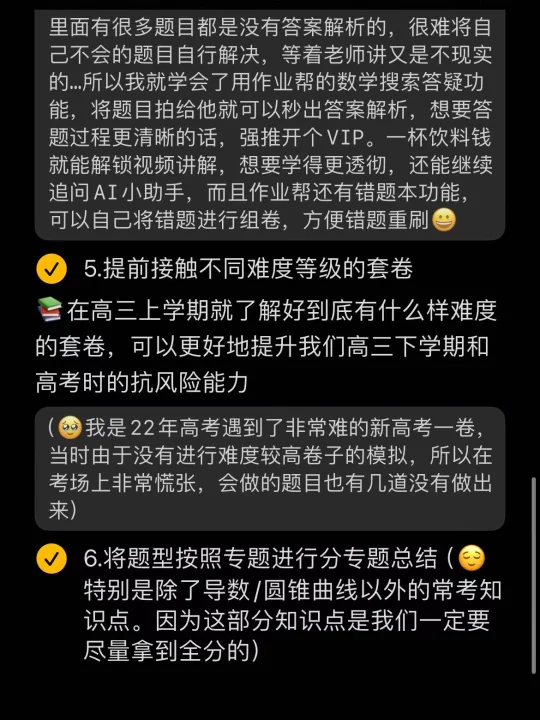 📘高中时期我们数学用的是《创新设计》这本教辅书,里面有很多题目都是没有答案解析的,很难将自己不会的题目自行解决,光等着老师讲又是不现实的…所以我就学会了用作业帮的数学都是答疑功能,将题目拍给它就可以秒出答案解析,想要答题过程更清晰的话,强推开个VIP,一杯饮料钱,就能解锁视频讲解,想要学的更透彻,还能继续追问AI小助手😌而且作业帮还有错题本功能,可以自己将错题进行组卷,方便错题重刷🥹