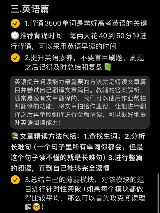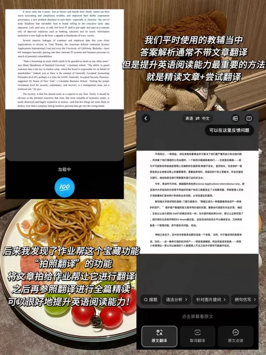 🔜英语提升阅读能力最重要的方法就是精读文章篇目并自己尝试翻译。教辅的答案解析通常是没有文章翻译的,我们可以使用作业帮“拍照翻译”的功能,将文章拍给作业帮让它进行翻译,之后再参照翻译进行全篇精读,可以很好地提升英语阅读能力✋