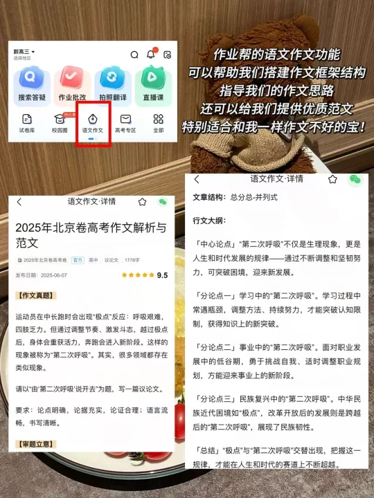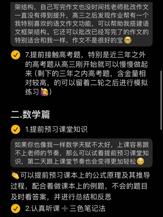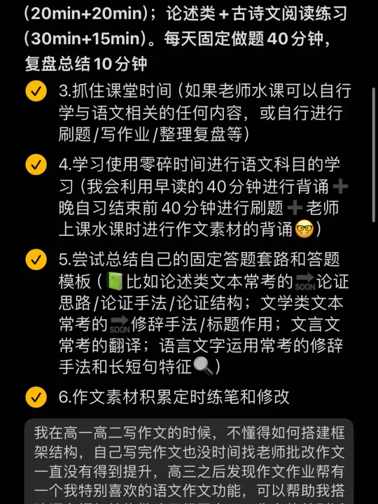 📒我在高一高二写作文的时候不懂得如何搭建框架结构,而且自己写完作文也没时间找老师批改,作文一直没有得到提升。后来发现作业帮有一个我特别喜欢的语文作文功能,可以帮助我们搭建文章框架结构、批改已经写完的作文等,特别适合和我一样作文不是很好的宝🤓
