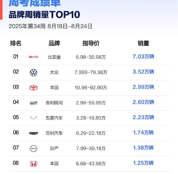 零跑连续四周蝉联新势力交付第一,C10累计交付15万台 第34周新势力周榜出炉,零跑交付1.21万台,不仅拿下周榜第一,而且连续四周蝉联新势力第一。与此同时,零跑还首次跻身全品牌榜前十,位列第九,高于奇瑞的1.18万台,距离本田的1.25万辆仅一步之遥。而在所有新能源品牌中也是排名第四,更是首次超越特斯拉(1.03万辆),成为唯一过万的新势力品牌。 零跑整体出色的销量表现源于旗下车型的热销,就比如26款C10,累计交付已经突破15万台,刷新了品牌记录。26款C10上市后更是连续3个月销量达到1万+,而且连续3个月排名新势力中型SUV销量冠军。而在出海方面,零跑C10海外销量超1.3万台,就连足球巨星欧文也成为了零跑C10的英国首位车主,妥妥的做到了全球热销。 而零跑C10能够做到全球热销,一方面源于零跑在同价格段做出来越级的产品力,零跑通过极致创新降本,从硬件和结构上压成本,以及从内部管理上提升效率。另一方面则是零跑+Stellantis是1+1>2,零跑借助Stellantis的体系开启全球化布局,这也让零跑C10的销售网络遍及海外。 现如今C10热销已成常态,接下来零跑还有D系列和B系列新车上市,累计销量90万台的零跑距离百万台大关近在咫尺了。