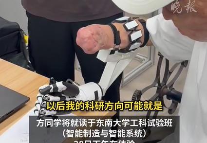 单指男孩东大报到,“未来我要造出自己的机械手!” 8月28日,在东南大学2025级本科新生报到前一天,迎来一位特殊的新生——方益凡,被烧伤,只有单指的他高考取得664分的高分。 他就读于东南大学工科试验班(智能制造与智能系统),28日下午在体验“肌电交互控制灵巧手”之后,他说,“我要在这好好学习,希望通过自己的努力,‘掌’握人生。”(记者 王赟 剪辑 戴哲涵)