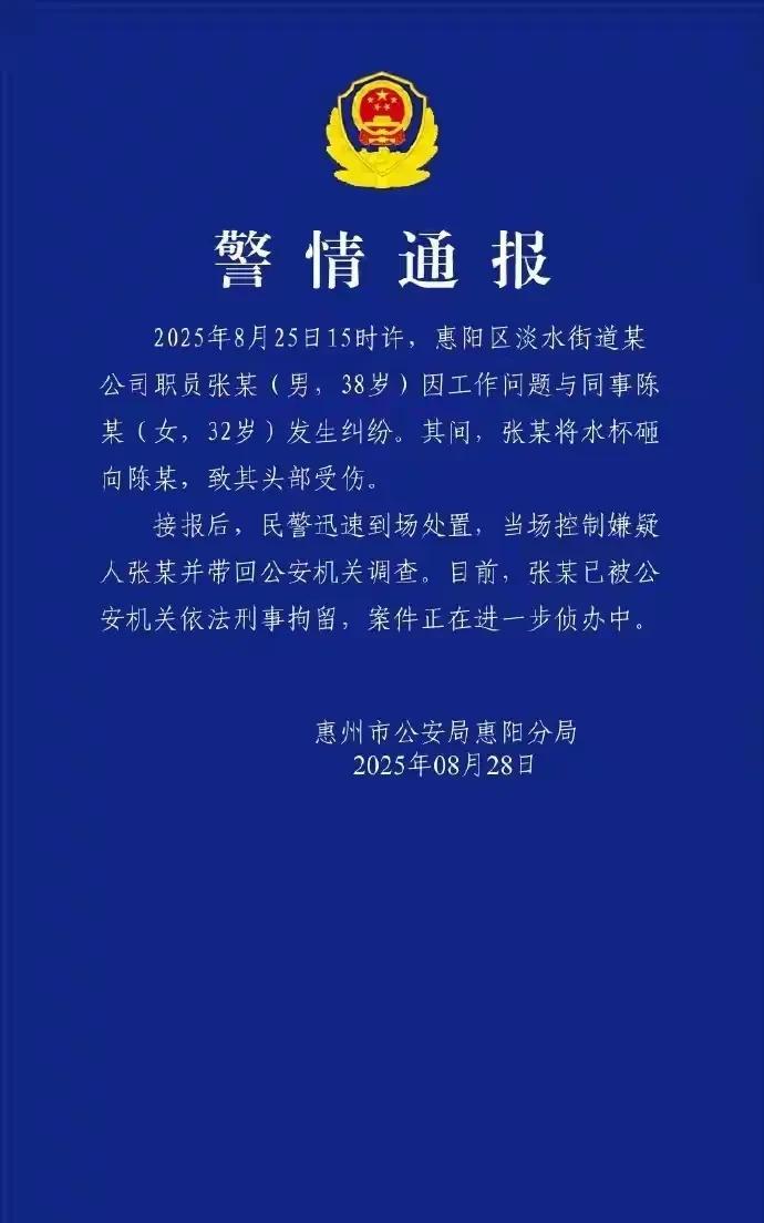 广东惠州,张某(男,38岁)因工作与陈某(女,32岁)发生纠纷,张某将水杯砸向陈