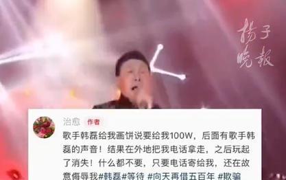 韩磊声明,韩磊方发声明,韩磊妻子声明 8月27日,辽宁网友“治愈”在社交平台发文称:歌手韩磊致其怀孕,承诺支付100万元补偿但未兑现,并以“防止隐私泄露”为由拿走她的手机拒不归还,其目前无法联系韩磊,引发热议。