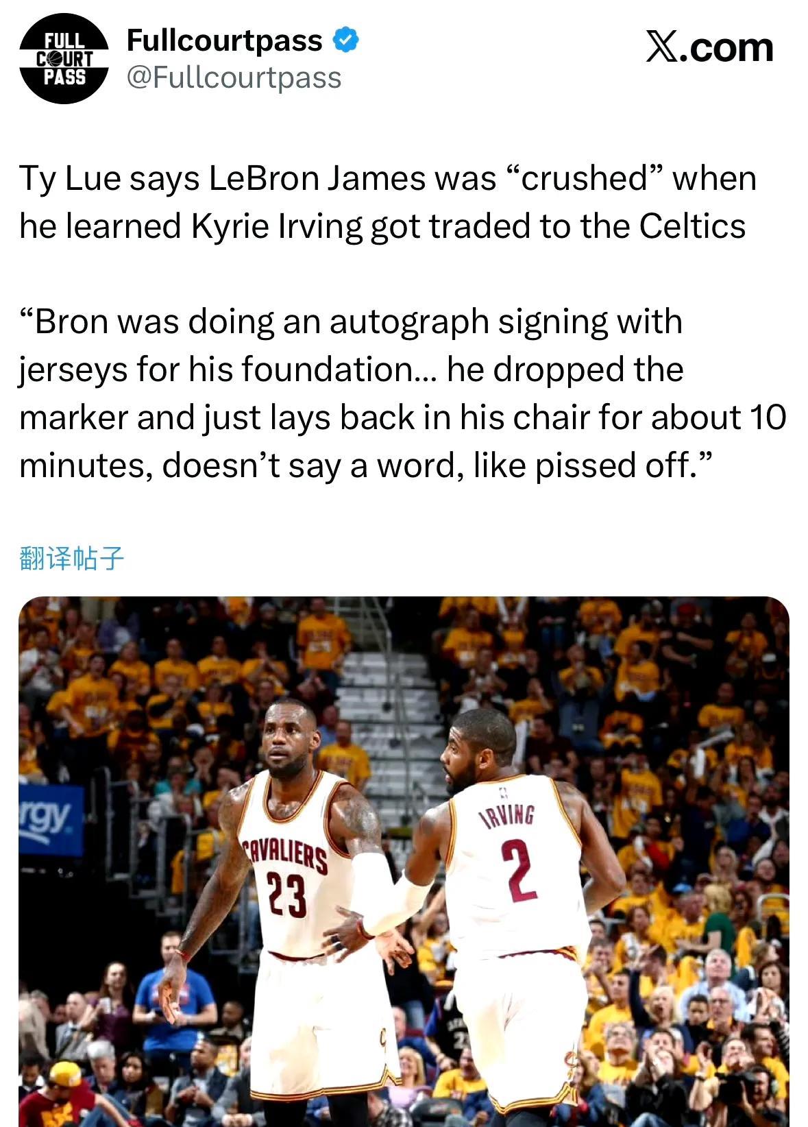 泰伦·卢表示,当詹姆斯得知欧文被交易到凯尔特人队时,他“非常沮丧”。
