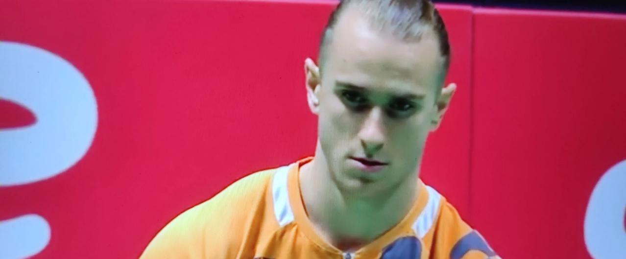 羽毛球世锦赛男单比赛,翁泓阳对阵法国选手拉尼尔。 第一局,翁泓阳开局4